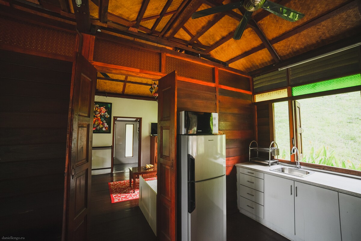 Ta prostorna Tropska lesena vila se ponaša s tradicionalno malezijsko arhitekturo z neoviranim pogledom na bazen. Okolica vasi je znana po svoji mirnosti, ki jo spremlja bujna zelena preproga neoluščenih polj. Nahaja se le 15 min-drive od območja Cenang Beach, prostor funkcije: studio (1 zakonska postelja in kavč, ki se lahko preoblikuje v 2 priloženi enojni postelji), vroče in hladne tuše, zračno kopalnico, ločeno kuhinjo, verando in otroško posteljico na zahtevo. Ni primerno za 2 para.