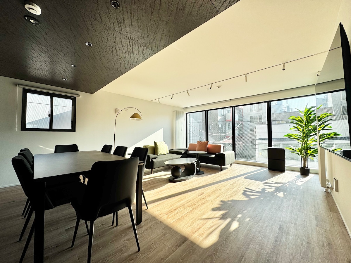 2025年7月にOPEN!サウナ付き5階建て新築ホテルのワンフロアを貸切でお使いいただけます。この部屋は4階にあり広さは約95平米です。2つの寝室には合計5台のベッドを設置しています。2つの寝室にはスモールシングルベッド(83cm×195cm)を3台とダブルベッド(140cm×195cm)を2台設置しています。宿泊人数が5名を超える場合はシングルマットレスと布団のセットを最大3つ用意できます。 【最寄り駅】 ・札幌市電「西線9条」降り場から徒歩5分(350m) ・地下鉄南北線「中島公園駅」2番出口から徒歩11分(700m) ・地下鉄南北線「すすきの駅」5番出口から徒歩17分(1.3km) 【駐車場】 先着1組限定で駐車場が利用可能です(予約制)。縦列駐車で最大2台まで料車できます。空き状況次第でのご案内となりますのでご予約時にメッセージで駐車場利用の有無をお知らせください。 【新千歳空港からの移動方法】 JR新千歳空港駅から乗車しJR札幌駅で下車。JR札幌駅から駅構内を移動し地下鉄南北線の真駒内駅行きに乗車し中島公園駅で下車。中島公園駅2番出口から徒歩約11分で到着します