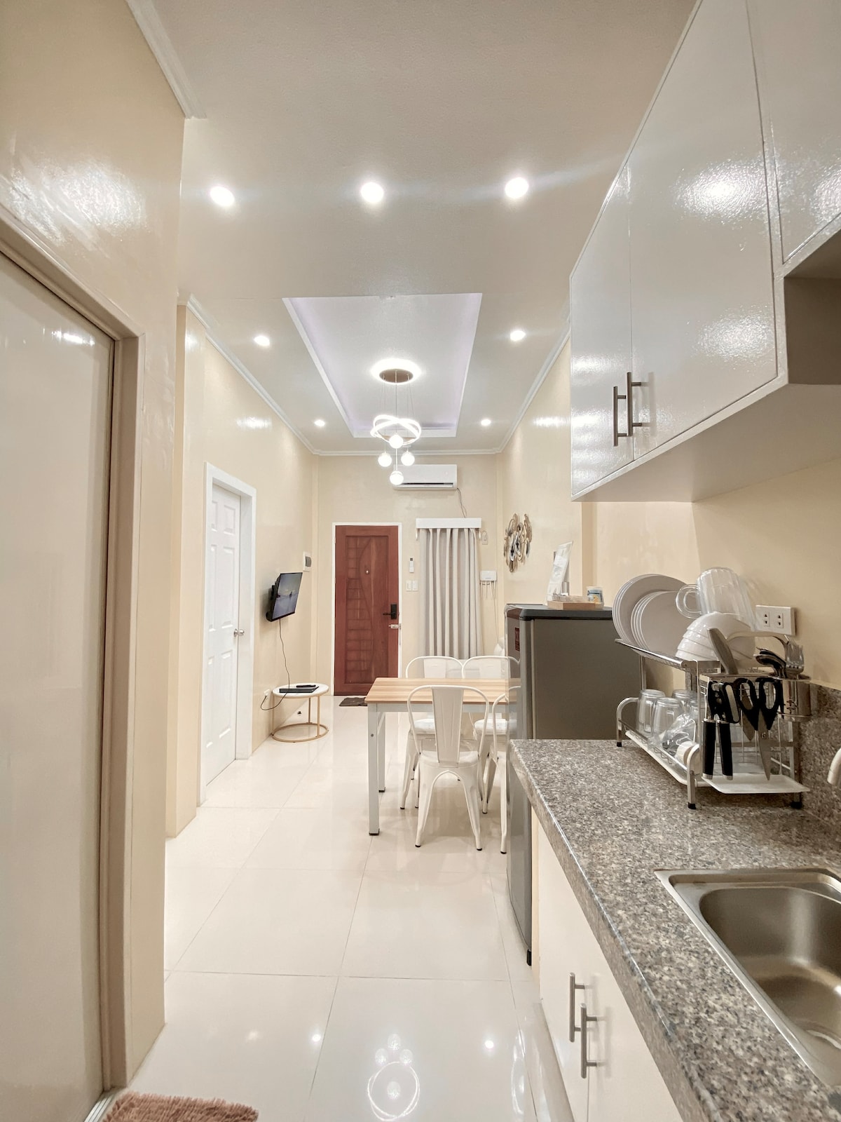 Optični Wi-Fi z Netflixom. 1 spalnica, popolnoma opremljena stanovanjska enota @ Abreeza Place Tower. Nahaja se v sklopu kompleksa Ayala Abreeza, 1 do 2 minuti hoje do nakupovalnega središča Abreeza (trgovine, restavracije, kot so TGI Fridays, menjava denarja / valut, banke, knjigarne, trgovine z živili, kinodvoran, kavarne, kot je Starbucks, in druge). To je kotna enota z velikimi okni od tal do stropa v jedilnici in dvema stranama spalnice. Ograjeno z 24-urno varnostjo. Na voljo za kratkotrajni ali dolgoročni zakup.