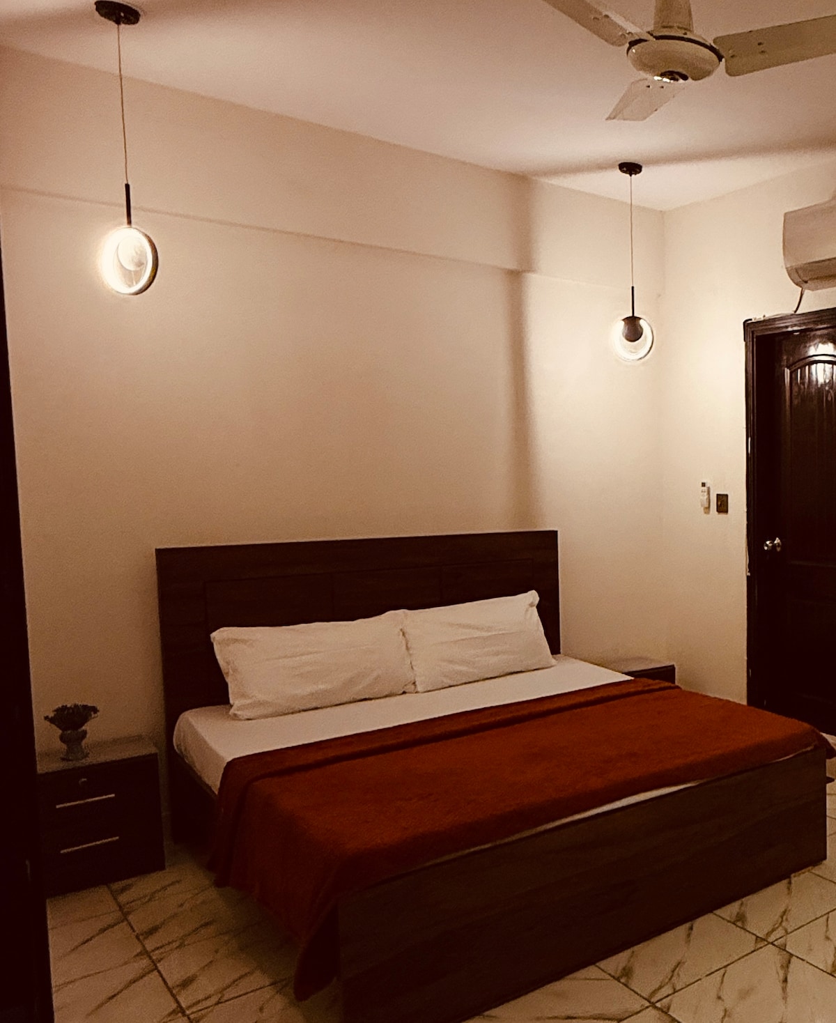 Ponovno odkrijte sprostitev z bivanjem na DHA Phase 5, Badar Commercial. Elegantna suita 1BR, primerna za družine, vključuje veliko zakonsko posteljo s svežo posteljnino, visoka francoska okna, udoben bivalni prostor, jedilnico in popolnoma opremljeno kuhinjo s štedilnikom, hladilnikom, mikrovalovno pečico in grelnikom za vodo. Uživajte v non stop Wi-Fi-ju, popolnoma novi klimatski napravi, dostopu do strehe, varnosti CCTV in oskrbnikih na kraju samem. Le 2 minuti stran od Seaviewa, v bližini pa so glavne prehrambene verige in banke. Brez drog, alkohola ali neporočenih parov.