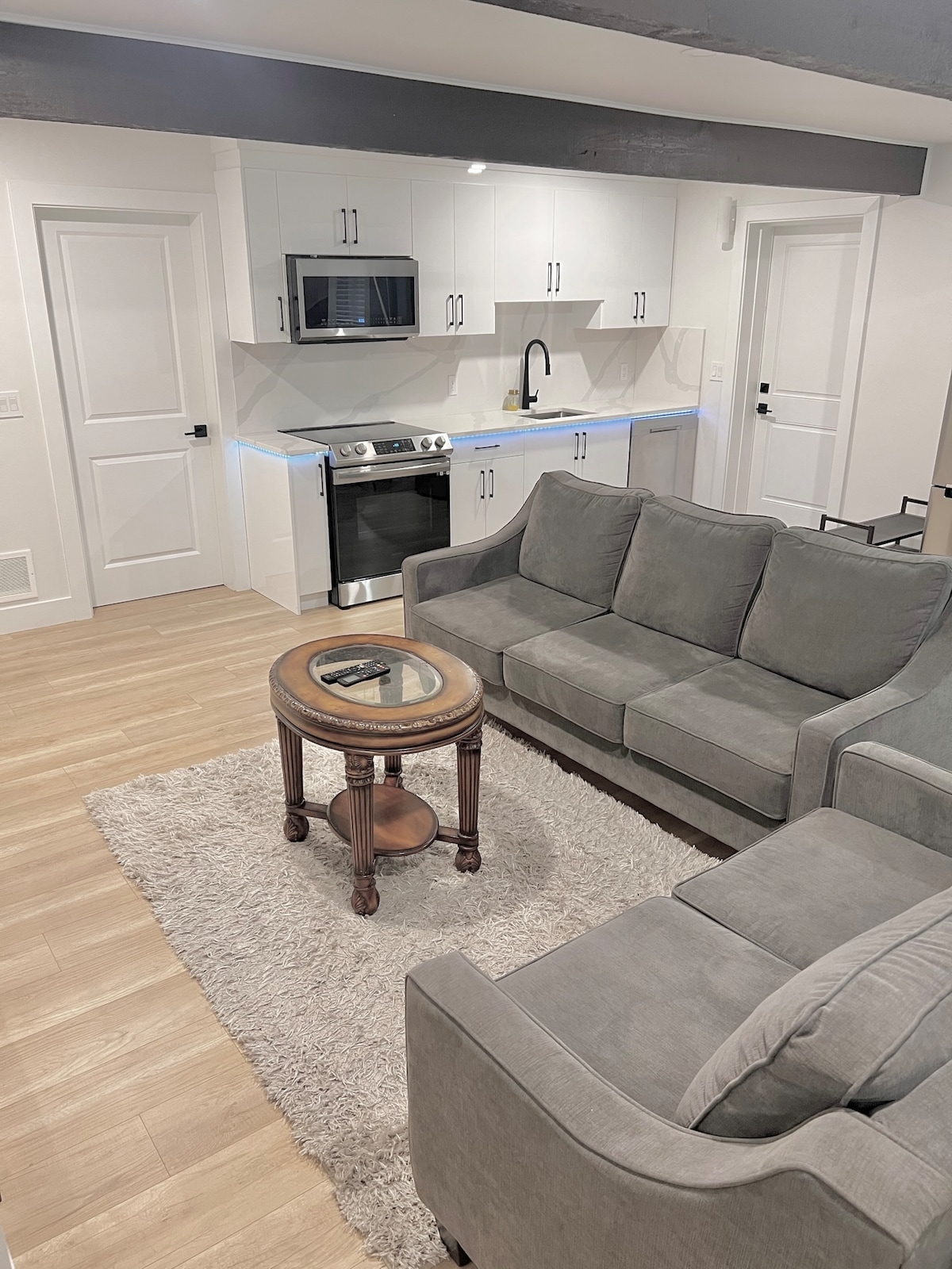 Udobna kletna suita ponuja popolnoma opremljeno kuhinjo, prostoren jedilni in dnevni prostor ter retro-moderno kopalnico. Dobro se naspite na zakonski postelji s svežo belo posteljnino in nebeškimi blazinami. Uživajte v brezplačnem Wi-Fi-ju in si oglejte svoje najljubše Netflixove filme na ogromnem televizorju s toplim električnim kaminom. Jutranja kava in steklenice vode so brezplačne. Nahaja se v mirni soseski, v bližini pa se lahko sprehodite po poteh. 20 minut vožnje od/do trajektnega terminala Tsawwassen. 30 minut vožnje od/do letališča YVR.