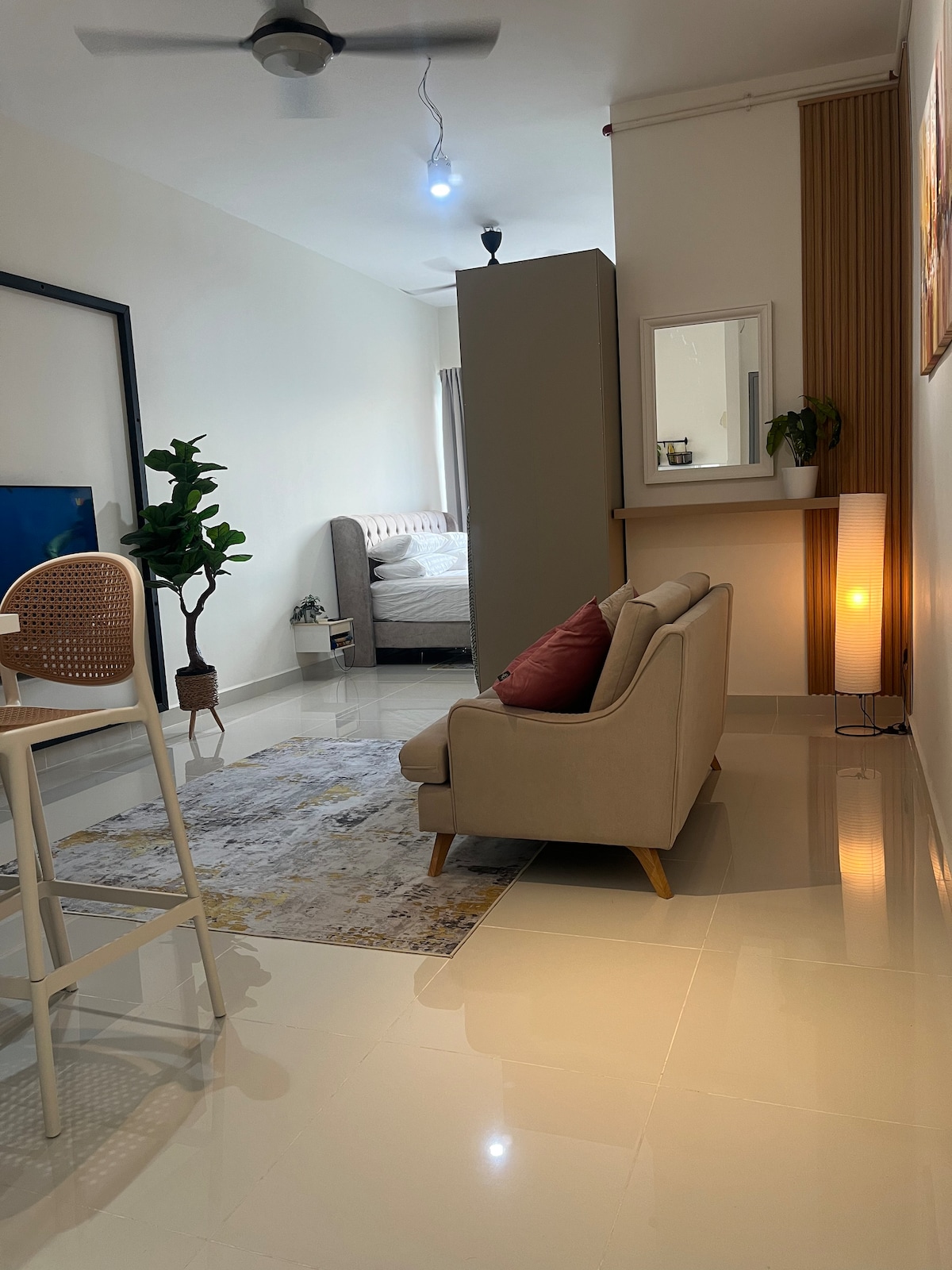 Step into a calming, Muji-inspired space designed for simplicity and rest. Accommodating up to 5 guests, this stylish apartment is just minutes from SplashMania Waterpark and close to KLIA — ideal for family getaways or short layovers. * Muji-style interiors *Premium Netflix *Walk to SplashMania *5 pax capacity – ideal for families * Netflix & Wi-Fi included *Qick drive to KLIA airport * Fully equipped kitchen & modern bathroom