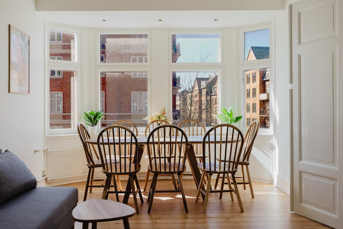 Wake up to soft light on pale wooden floors and enjoy your coffee in the bright, open kitchen. The space feels warm and personal, with art, photos, and cozy touches. Step onto the balcony for a view of the leafy square. Located between Fælledparken and Svanemøllen Beach, with shops, cafés, and public transport nearby. The metro is just a minute away, and the city center is 10 minutes by bike. Street parking is available via EasyPark, with free options nearby.