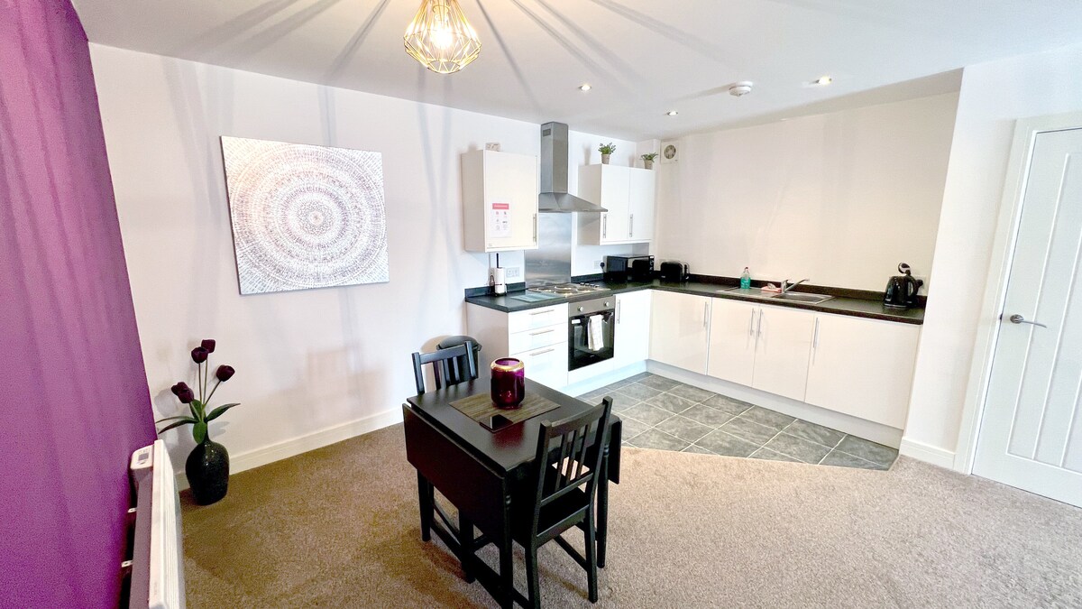 Well maintained cosy separate residence with secure parking, 1m from motorway & walking distance to Stafford town centre (20 mins) - close to local amenities (gym/ restaurants / supermarket / launderette / bowling / laser tag). The coach house is an annexe in the gardens of our house with a double bedroom on the mezzanine level. Downstairs, a king size sofa bed in the lounge, well equipped kitchenette and bathroom with good shower and bath. 2 SMART TVs with 2 DVD players & Fibre wifi.