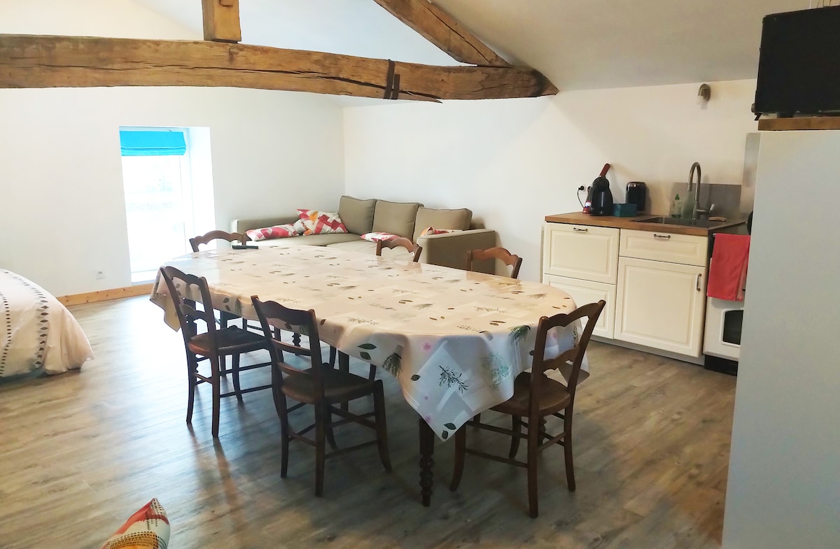 Velika nastanitev, vključno z enojnim prostorom 45 kvadratnih metrov z opremljeno kuhinjo ( pečica, mikrovalovna pečica, kuhalna plošča, hladilnik) . Dnevni prostor s clic-clac posteljo, postelja (nova posteljnina160/200) , jedilnica s 4 stoli, garderoba... Velika prha, sušilnik za brisače... To je za največ 4 osebe (otroci, vključno z otrokom). Velika terasa z mizo in stoli s pogledom na vrt, ki ni spregledana. (Brez lastnika). Žal hišni ljubljenčki niso dovoljeni