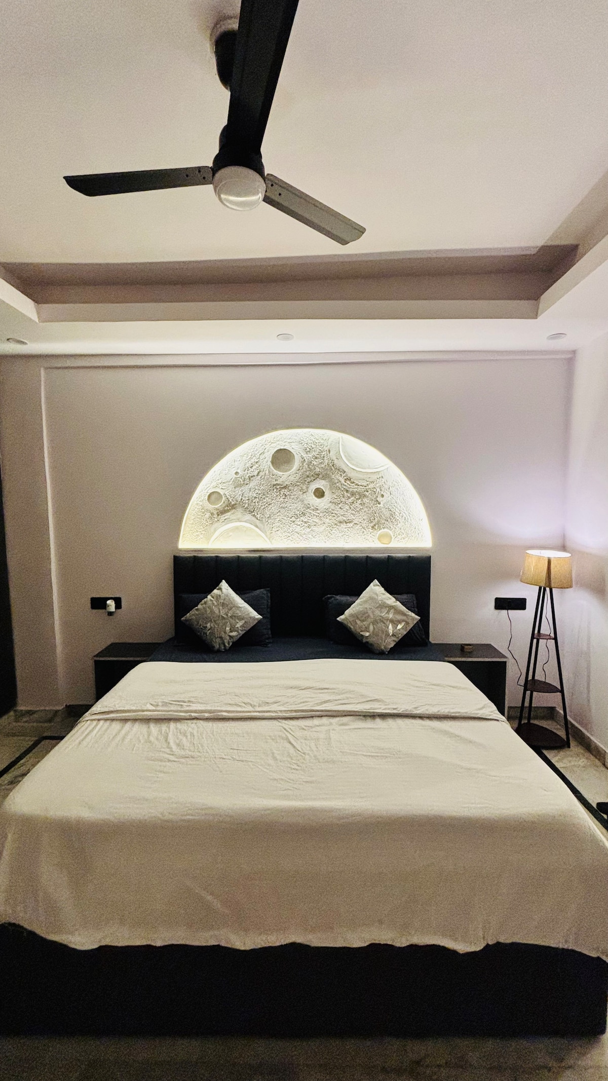 A modern, well-designed space with a calm and elegant vibe. The bedroom features a large comfortable bed, soft lighting, and a striking moon-themed backlit wall that adds a unique, cozy feel. The false ceiling and neutral tones enhance the premium look. The bathroom is clean and contemporary with marble-style tiles. A compact kitchenette with storage, sink, fridge, and essentials makes the stay convenient and comfortable.