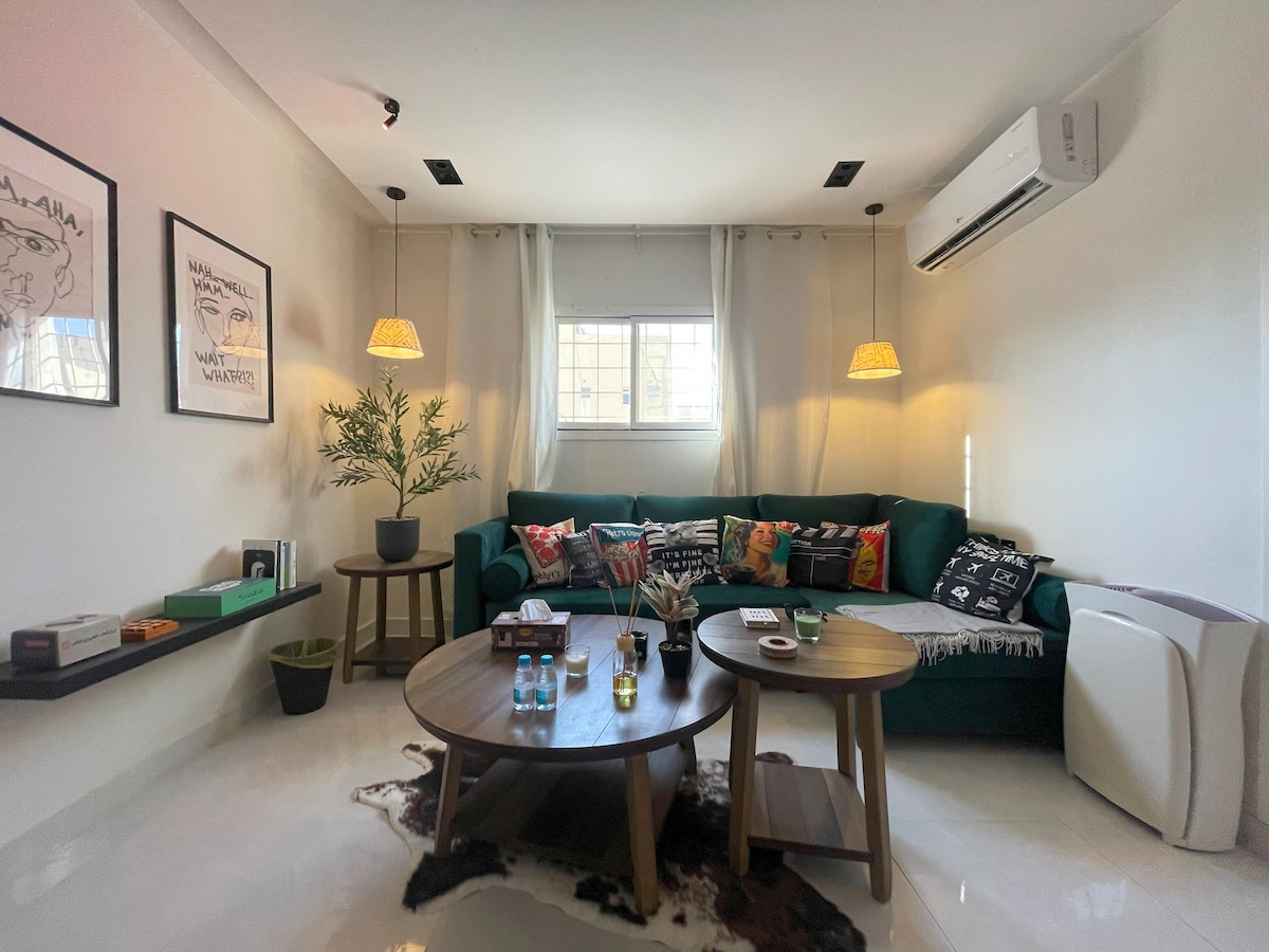 Razkošno stanovanje se nahaja v osupljivem kompleksu v prestižni soseski. Uživajte v osupljivem razgledu na vrt skozi okno, popolnoma opremljeno kuhinjo, aparat za kavo in 75-palčni pametni televizor. Idealno se nahaja v bližini najboljših turističnih znamenitosti in prizorišč za zabavo, vključno z Diriyah, Boulevard City, Boulevard World in še več. Vrhunski kompleks Thagher je oddaljen le 12 minut hoje in ponuja vrsto restavracij, kavarn in trgovin za prefinjeno kulinarično in nakupovalno izkušnjo.
