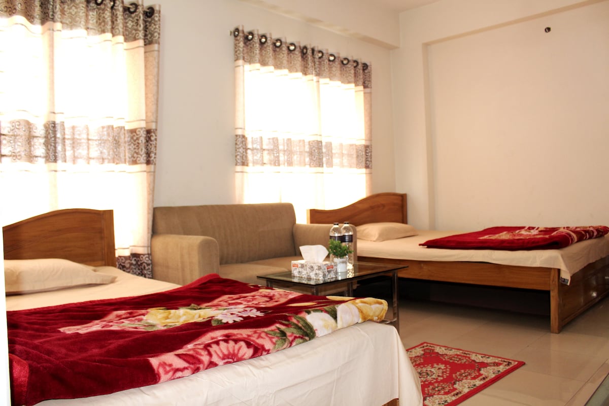 "This is a residential apartment. You can hire a full apartment including five bedrooms some with balcony, A long living cum dining area, a kitchen, 1 bathrooms. just a single bed room, table-chair, Almira, Fan etc. and all necessaries. Breakfast Service available on request. Car service also available on request (Extra cost). Wi-Fi internet. Safe & Secure. Walking distance to public transport Country’s safest area to live.We are Located at Diplomatic Zone in Bangladesh