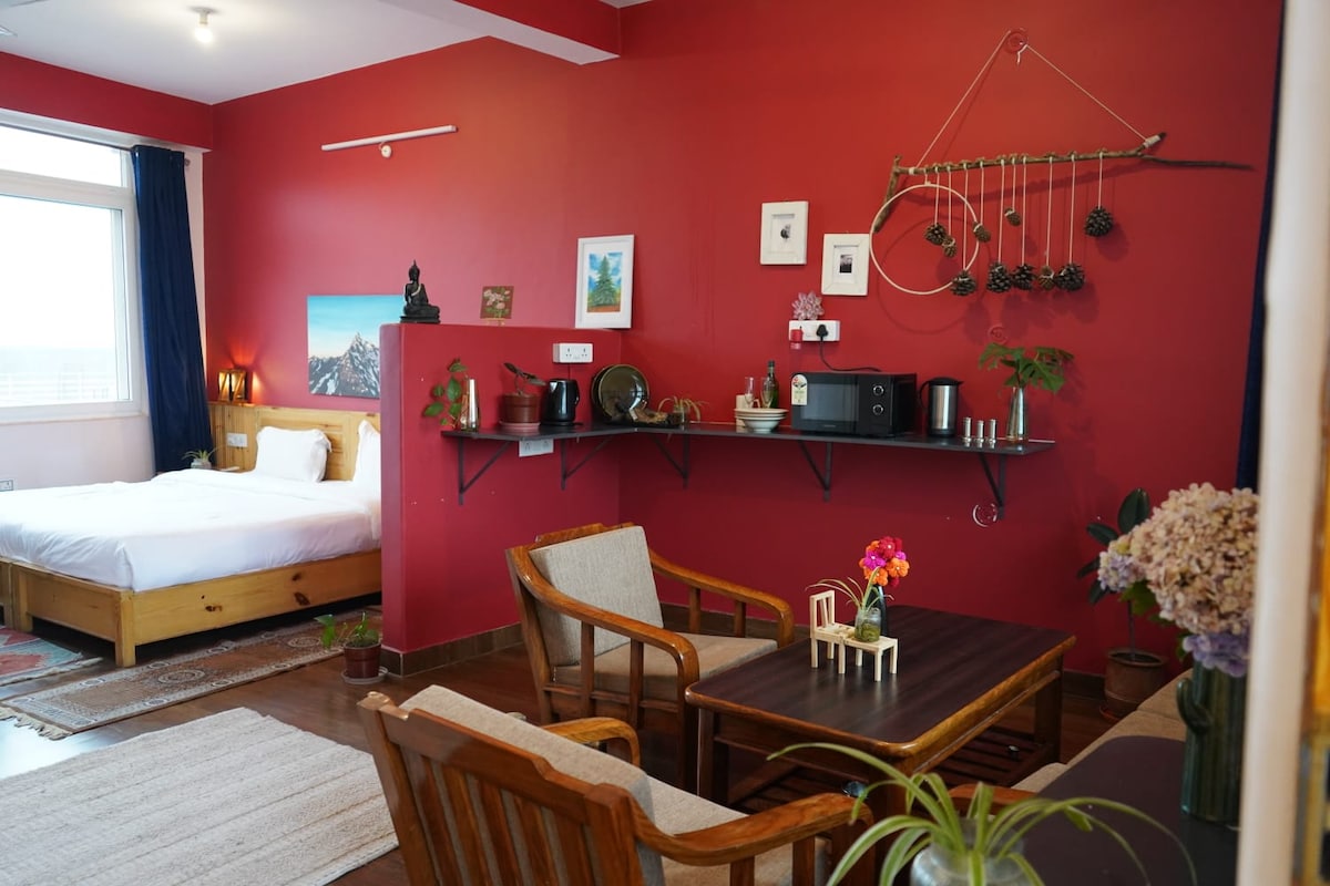 Čudovita boemska garsonjera s čudovitim razgledom na gore. To je prostorna garsonjera z eno zakonsko posteljo , eno enojno , kuhinjsko nišo in kopalnico. Notranjost vile Wildflower bo poskrbela, da se boste bolj zaljubili v bivališče, saj je bilo v celoti narejeno z ljubeznijo. • 500 metrov navzgor od glavne tržne ceste Bir na cesti Zostel • Kavarne in samostani so oddaljene le nekaj metrov. • Inštitut Deer Park je ena od najbližjih znamenitosti namestitve.