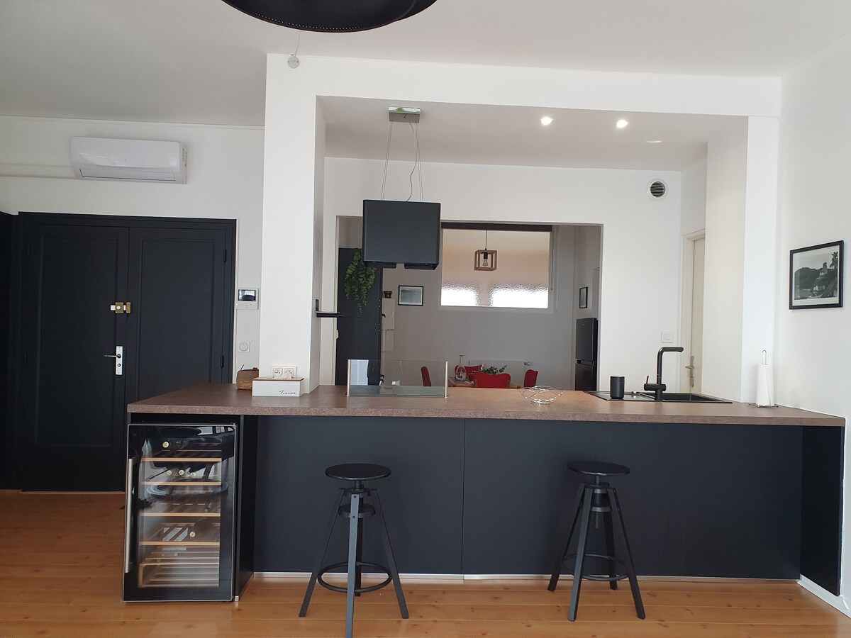 V celoti smo prenovili naše stanovanje v središču mesta, da bi ustvarili topel in udoben prostor za življenje. Vse je namenjeno vašemu udobju: prijetna dnevna soba, opremljena kuhinja, spalnica z udobno posteljnino in sodobna kopalnica. Našli boste vse, kar potrebujete za brezskrbno bivanje: Wi-Fi, pralni stroj, sušilnik za lase… Ne glede na to, ali potujete ali potujete, vas bomo z veseljem sprejeli.