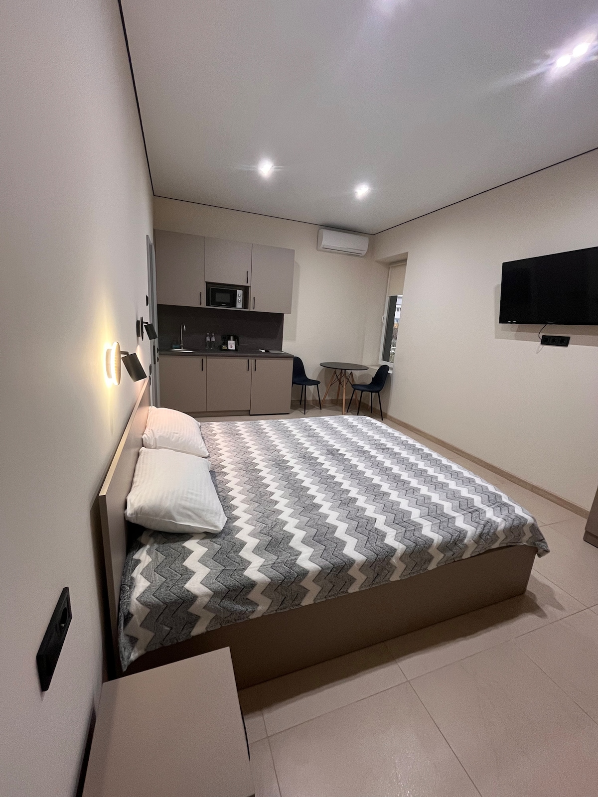 Просторий світлий номер з легкими сірими відтінками. У центрі — королівське ліжко для розкішного відпочинку, а невелике віконце пропускає природне світло, створюючи затишок і умиротворення. В номері є все для комфортного проживання; простір наповнений світлом і спокоєм, ідеальний для відпочинку в укритті.