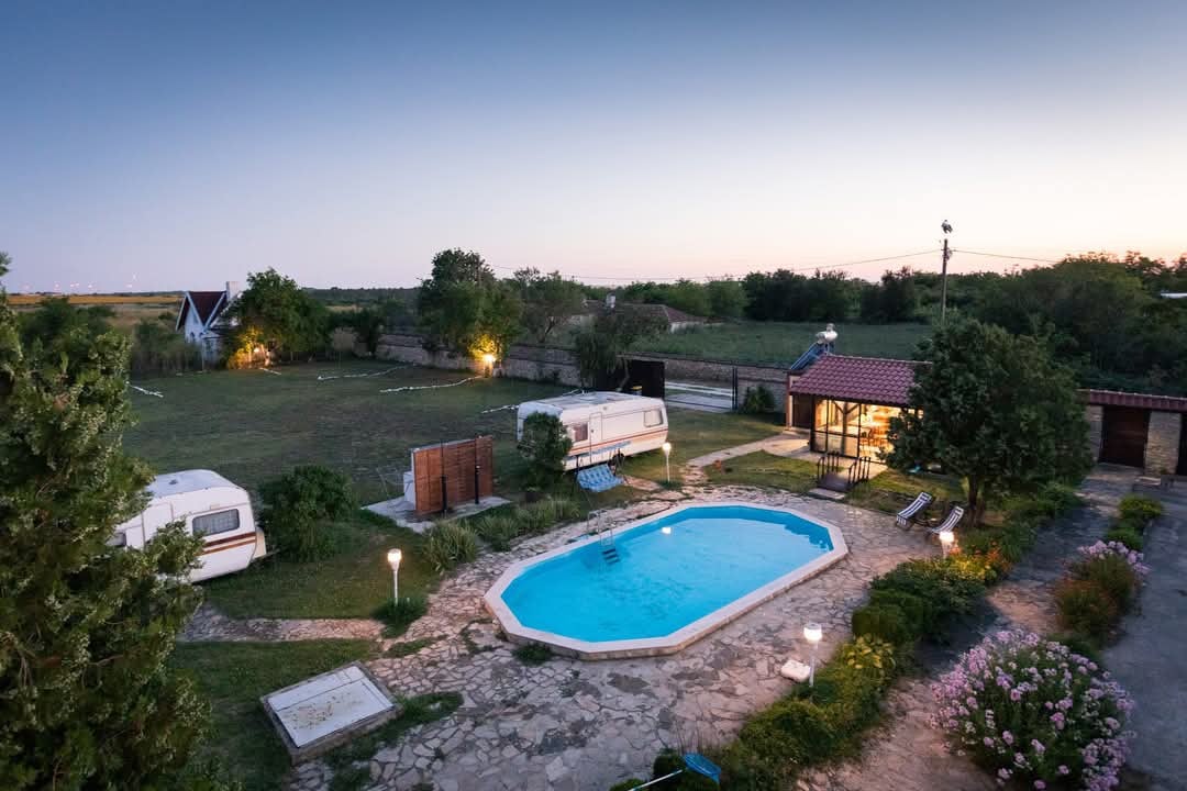 Kompleks posebej opremljenih glamping šotorov, ki se nahajajo v čudovitem zaselku Tyulenovo! Med temi nepozabnimi počitnicami ponovno vzpostavite povezavo z naravo. Kompleks ima pet šotorov s premerom 4 metre, od katerih je vsak opremljen z udobno dvojno vzmetnico in je primeren za dve odrasli osebi. Oglašena cena velja za en šotor. Kompleks ima dve kopalnici in dve stranišči, zunanjo kuhinjo z žarom, prostor za sprostitev, velik zeleni travnik in zelenjavni vrt.