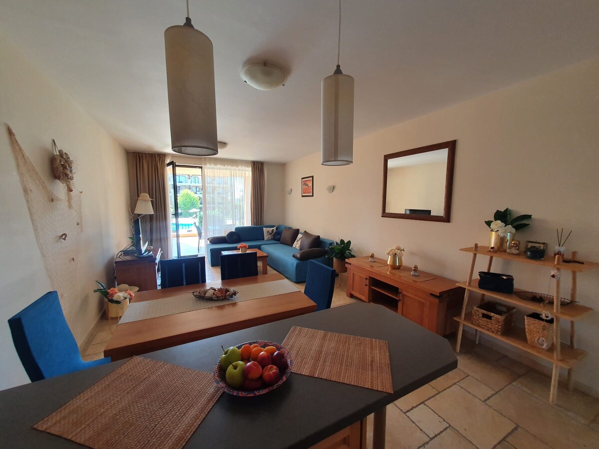 Stanovanje se nahaja v letovišču s 4 zvezdicami, polnem zelenja in sanjskih pokrajin, razgled na Črno morje pa je čudovit. To elegantno prenočišče je kot nalašč za družinska potovanja s skupno površino 90 m2 in je popolnoma opremljeno za uspešne počitnice. Dostop do varovanega parkirišča, 5 bazenov, ležalnikov, senčnikov, vzmetnic, telovadnice, notranjih/zunanjih igrišč je brezplačen. Letovišče ima tudi 4 restavracije z različnimi posebnostmi