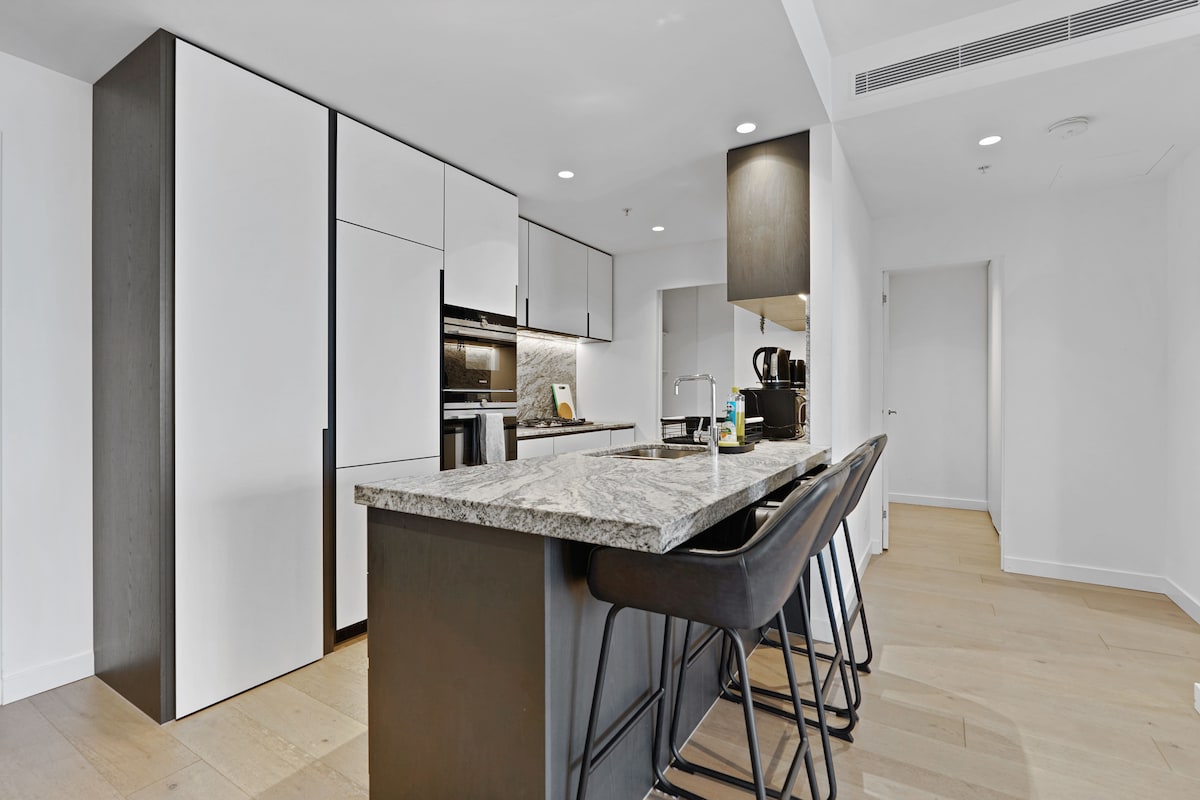 Ta čudovit pogled na morje in parket 2B2B ima čudovito notranjost in sodobno zasnovo. Neverjetna oprema v sklopu hotela in lokacija v središču mesta. Minute od restavracij, nakupovalnih in zabavnih središč v Mebournu. Nahaja se poleg postaje Southern Cross in je obdan s tramvajskimi postajališči, kavarnami, znamenitostmi in trgovinami. Eleganten dnevni in jedilni prostor se združuje z marmorno kuhinjo. Zimski vrt v glavni sobi se lahko uporablja kot delovna soba ali čajnica. Brezplačen hiter WI-FI. Nexflix TV. Nad vsemi potrebščinami.