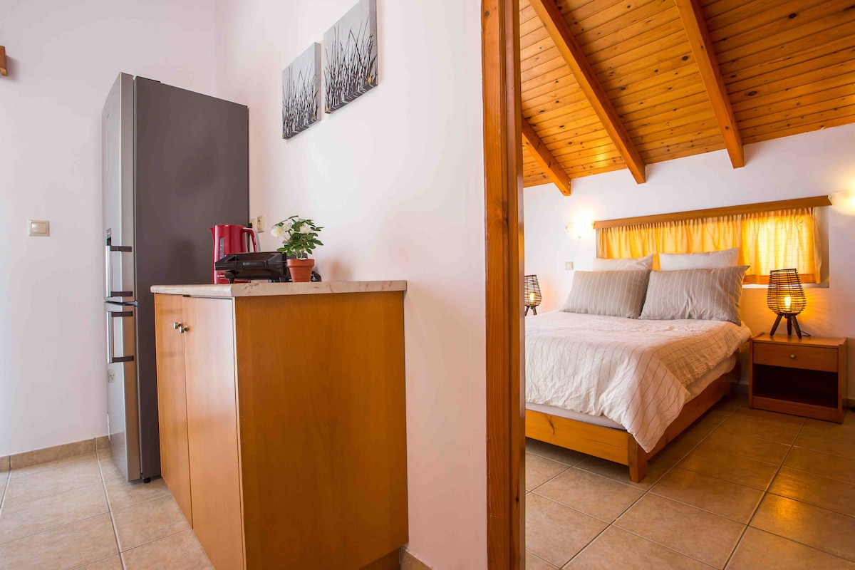 Udoben, eleganten, udoben in razkošen studio. Moje bivališče je odlične kakovosti in popolnoma opremljeno le 2 min od plaže. Velika veranda velikosti 70 m2 ponuja osupljiv razgled na Egejsko morje. Na voljo je velika miza s stoli in oblazinjenimi kavči, da lahko uživate v obroku ali pijači, medtem ko občudujete celoten pogled na morje, romantične sončne zahode in sončne vzhode. V prvem nadstropju vile Rodia je dostopna z 18 marmornimi stopnicami.