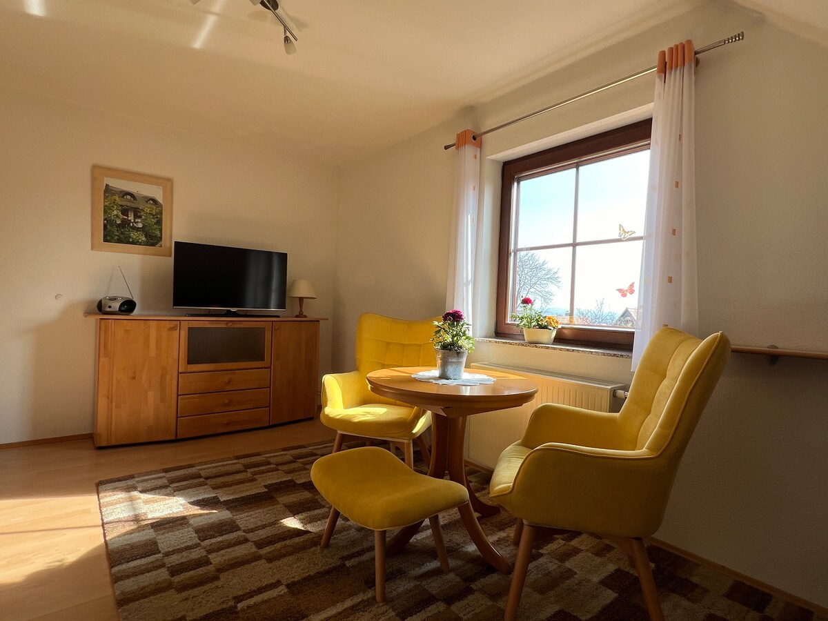 Pozdravljeni ! Najemam stanovanje v velikosti 54 m² (2. nadstropje) z velikim balkonom in pogledom na Lugberg ter z dobro vidljivostjo vse do Saške Švice. Stanovanje je primerno za 2-4 osebe in je popolnoma opremljeno. Ima 1 spalnico (zakonska postelja) in dnevno sobo s televizijo, sedežno garnituro in raztegljivim kavčem (1,40 x2 m). Kuhinja ima štedilnik, mikrovalovno pečico, predel za sedenje in vključuje vse, kar je potrebno za kuhanje ali peko. Kopalnica je opremljena z WC-jem, WB in prho.