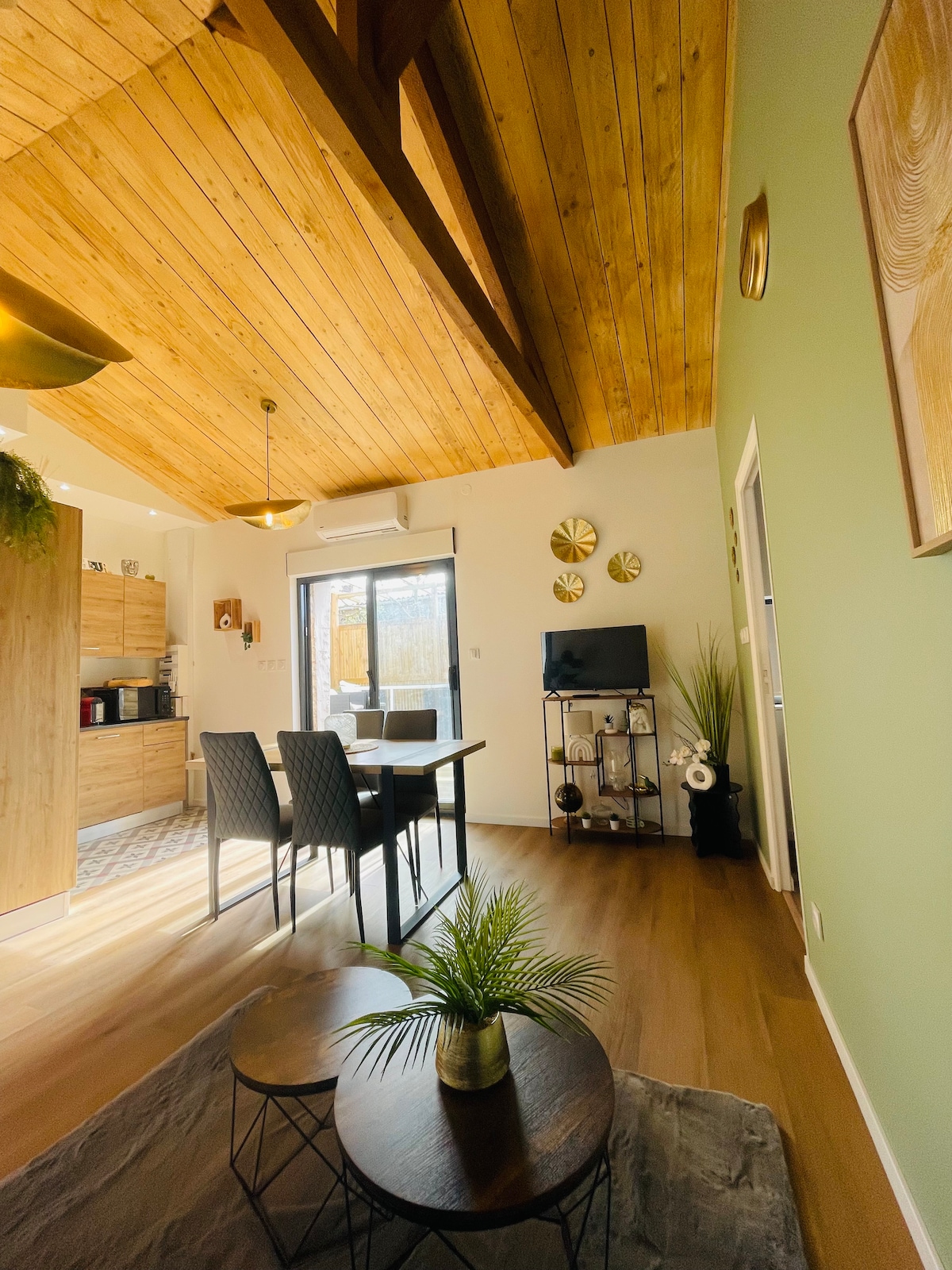 Namestitev z značajem in urejeno dekoracijo. 1 velika spalnica za 2 osebi, prha, ločeno stranišče Dnevna soba z udobnim raztegljivim kavčem s pogledom na teraso in zasebnim vrtom, ki ni spregledana, opremljena z vrtnim pohištvom, senčnikom, ležalniki in žarom. Popolnoma opremljena kuhinjska niša, pomivalni stroj.