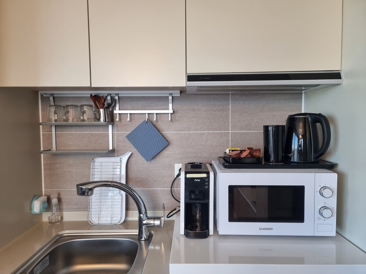 Pozdravljeni, ^ ^ To je Trustay, ki živi lokalno in upravlja nastanitev. Ko vstopite na vhod, vas bo čudovito morje sprejela skozi okno dnevne sobe. Preživite sproščujoče jutro z odhodom ob 12.00 Vrsta sobe - 1,5 sobe (spalnica + dnevna soba, kuhinja + stranišče) Uživate lahko v najboljšem pogledu na ocean iz 10. nadstropja z visokim pogledom na ocean. Uživate lahko v videoposnetku OTT, kot sta Netflix in YouTube. Izpolnite prostor po svojih željah z zvočnikom Bluetooth To je 5 min vožnje s taksijem od postaje KTX Mukho/postaje Donghae in avtobusnega terminala Intercity. Do plaže Hansom se lahko sprehodite v 3 minutah hoje. V 5 minutah hoje je enostavno priti do restavracij, prvega nadstropja stavbe, trgovine E-Mart 24, E-Mart, trgovine z živili, Daiso, kina Lotte itd. Oprema je na voljo v stavbi, kot so opazovalna terasa na strehi, fitnes in pralnica s kovanci. (Delni strošek) - drugo - 1. Na dan prihoda vam bomo poslali sporočilo (geslo za digitalno zaklepanje vhodnih vrat, jezero in navodila) na dan prihoda. 2. Naslov namestitve: 136-4, Hansum-ro, Donghae-si, Gangwon-do