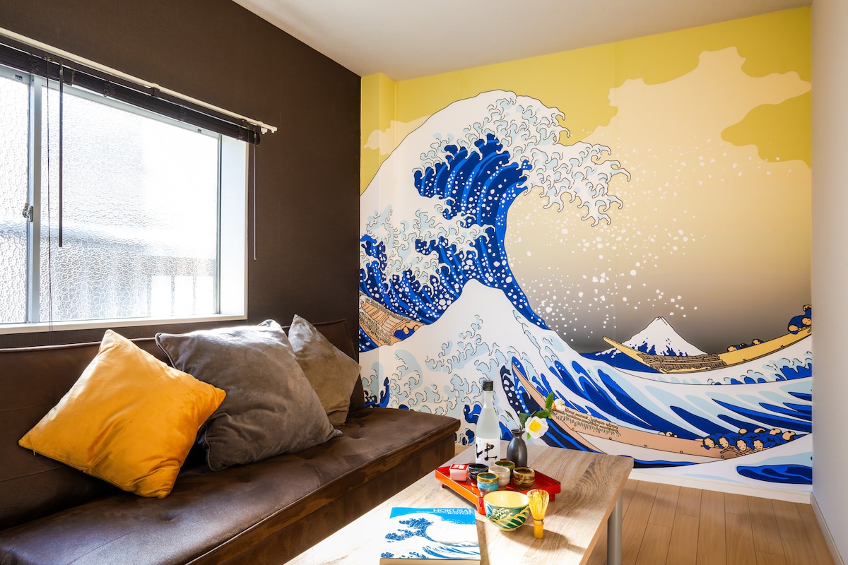 【グランドオープン記念セール!】 ご予約は今がチャンス 道頓堀まで歩ける立地。 宿は大阪の中心部にあり、どこに行くにも便利。ゲスト全員が楽しめます。 広さ84㎡の一軒家、2階と3階が自由に使えます。 3部屋の独立した寝室、6台のベッドがあるので2家族や友達同士での滞在でもゆったりと過ごすごせます。 日本文化を感じリラックスできるアート空間 (部屋のテーマ) ・浮世絵 北斎シアタールーム ・金の間 寝室 ・KIMONOの寝室 ・ゴッホの寝室 広いリビングルーフバルコニーで食事や喫煙可能。 プロジェクター「Nebula Nova」が完備されたシアタールームで楽しい時間を過ごせます。 ※※注意※※ エレベーターは無しです。2階、3階まで階段を使います。日本の階段は狭くて傾斜が急です。歩行が困難な方や高齢者の方にはお勧めできません。スーツケースの階段移動は大変ですので予めご了承ください。階段の写真を事前にご確認ください。
