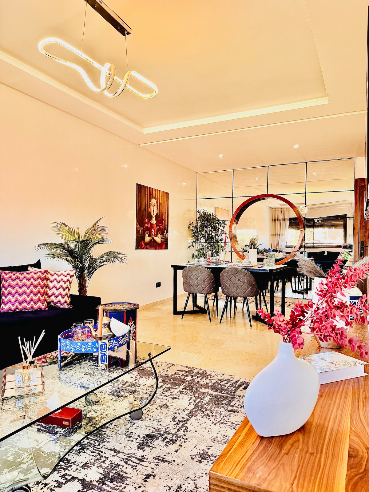 Odkrijte razkošno stanovanje, ki ga je sveže zasnoval priznani arhitekt in združuje sodobno zasnovo z pristnimi maroškimi detajli. To zatočišče miru, ki je dostopno prek najbolj elegantnega nakupovalnega središča v Marakešu, vas vabi v prefinjenem in varnem okolju. Popoln mir in klimatska naprava v vseh sobah Opremljena in vegetacijska terasa z zasebnim jacuzzijem Dve kopalnici Celoten sistem IPTV za dostop do mednarodnih kanalov