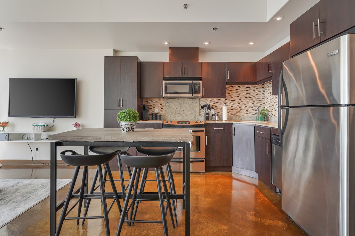 Ta neverjetna dvosobna vogalna suita, ki se nahaja na območju Beltline v središču mesta, se ponaša z okni od tal do stropa, ki v zgodnjih popoldanskih urah preplavljajo prostor s sončno svetlobo in prikazujejo osupljiv razgled na mesto. Ta prostor je opremljen z udobnim dnevnim prostorom, določenim delovnim prostorom, elegantnim barom za večerjo, priročnim podzemnim parkiriščem, hitrim internetom in zasebno teraso. Ponuja vse, kar potrebujete.