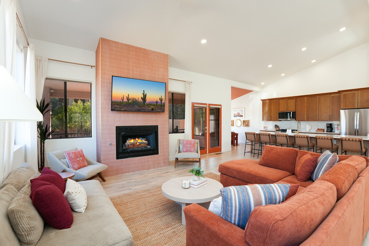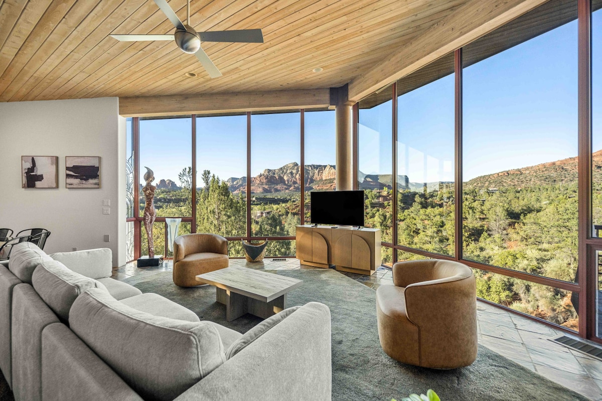 Indulge in breathtaking sunset vistas of the majestic Red Rock Mountains through the expansive windows of this luxurious 3-bedroom abode. Immerse yourself in upscale living with carefully curated furnishings and exquisite artisanal decor. Whether you prefer savoring your morning coffee on the serene side patio or lounging on the spacious back deck, this immaculate home offers the perfect retreat. Experience ultimate relaxation with a private Jacuzzi, and enjoy the convenience of essential amenities for your comfort. With easy access to the neighborhood trailhead and proximity to restaurants, shops, and galleries just a half-mile away, this tranquil oasis strikes the ideal balance between convenience and serenity. Plus, stay productive with a designated workspace and printer readily available. Experience luxury living at its finest.