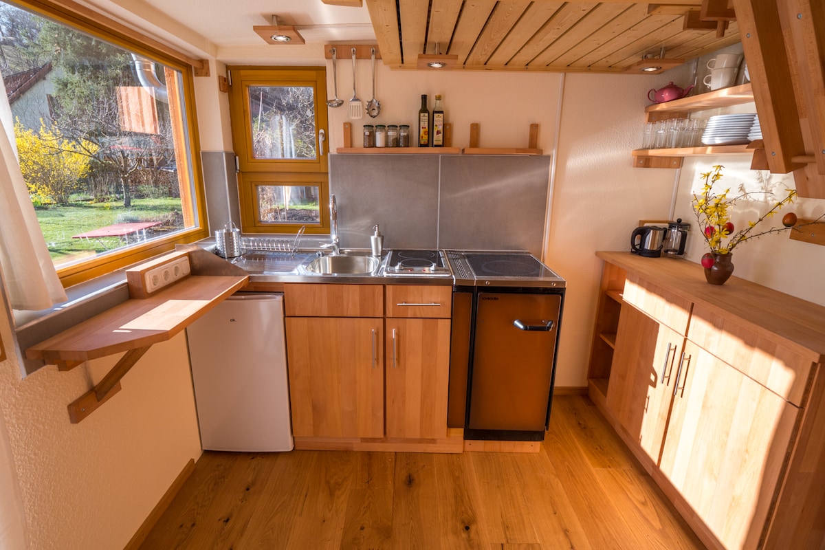 V ljubeznivi podrobnosti je bila na našem vrtu na 9 kvadratnih metrih ustvarjena mini-hiška. Z veliko lesa in zmanjšanjem osnovnih potrebščin lahko majhno sobo poživite z največ štirimi osebami. Z velikimi okni in neoviranim razgledom na podeželje je čudovit kraj za sprostitev od izletov v mesto ali Schwarzwalda.