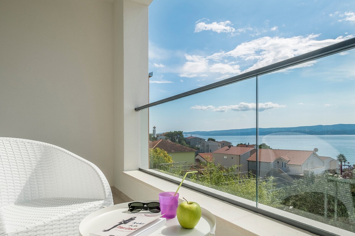 Stanovanje meri 100 m2 in se nahaja v 2. nadstropju hiše. Ima čudovit razgled na morje in otok Brač. Sestavljen je iz dveh spalnic z zakonskimi posteljami in enega dodatnega ležišča, dveh kopalnic, kuhinje in dnevne sobe. Stanovanje je klimatizirano, ima 3 pametne televizorje in opremljeno kuhinjo. Do čudovite peščene plaže in morja morate prečkati cesto. V bližini hiše so restavracije, bari, trgovine, pekarne in sadne trgovine. *Za vsako stanovanje je na voljo eno parkirno mesto.