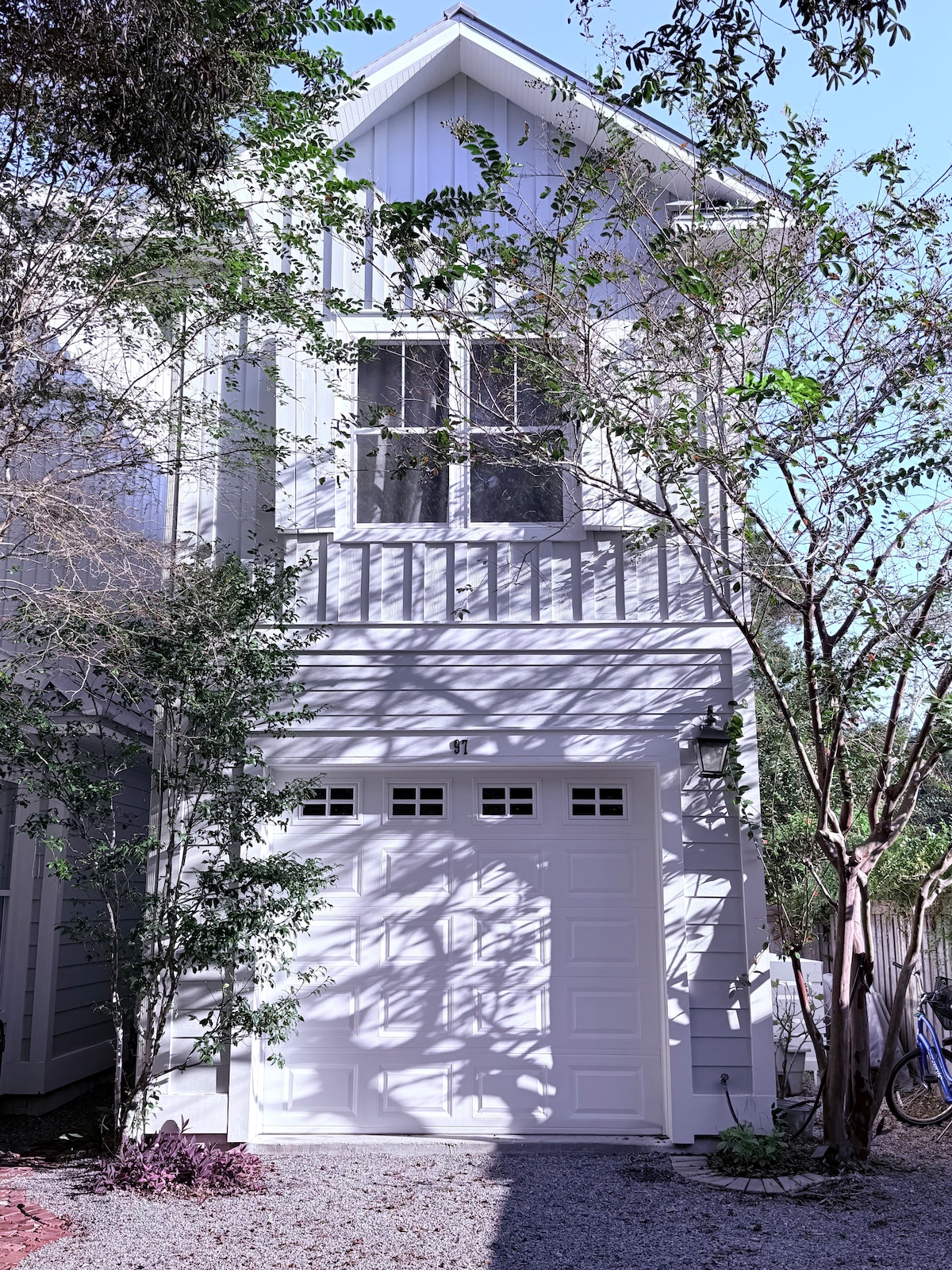 Sodobno nad garažno garsonjero z zasebnim vhodom in teraso. 1,5 ulic od plaž South Walton! Uživajte v velikem dnevnem/jedilnem prostoru in ločenem prostoru za spanje z zakonsko posteljo. Kavč se spremeni tudi v zakonsko posteljo. Ločena kuhinja s hladilnikom, štedilnikom in mikrovalovno pečico. Dva televizorja z ravnim zaslonom in zasebnim brezžičnim internetom, prenosom v živo, Netflixom in HBO. Uživajte v najnovejši javni plaži 30A, le kratek sprehod, tik ob koncu naše ulice.