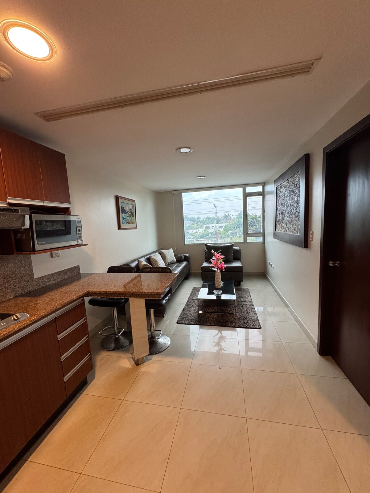 Čudovita suita z zasebno teraso na severu Guayaquila, dobro osvetljeni, udobni in sodobni prostori. Idealno za pare ali poslovna potovanja. Veličasten razgled na Guayaquil. To je zelo blizu glavnih mestnih točk: letališča, kopenskega terminala, zdravstvenih centrov, bencinskih črpalk in nakupovalnih centrov. Idealno za praktično in prijetno bivanje.