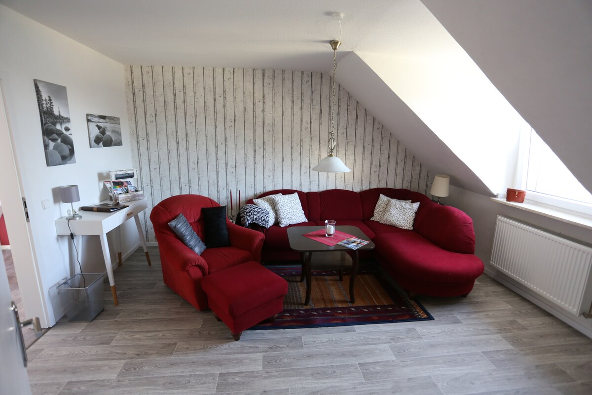 Dobrodošli v naši svetlobno poplavljeni 90 kvadratnih metrih oazi z ložo. Zelo mirna in podeželska lokacija, stanovanje se nahaja v 1. nadstropju naše samostojne hiše. Tukaj živite na podeželju, na robu območja Ruhr in še vedno lahko hitro pridete do znamenitosti Ruhrpotts. Če iščete mir in tišino, ste na pravem mestu. Če želite mestno življenje, izberite drugo prenočišče.