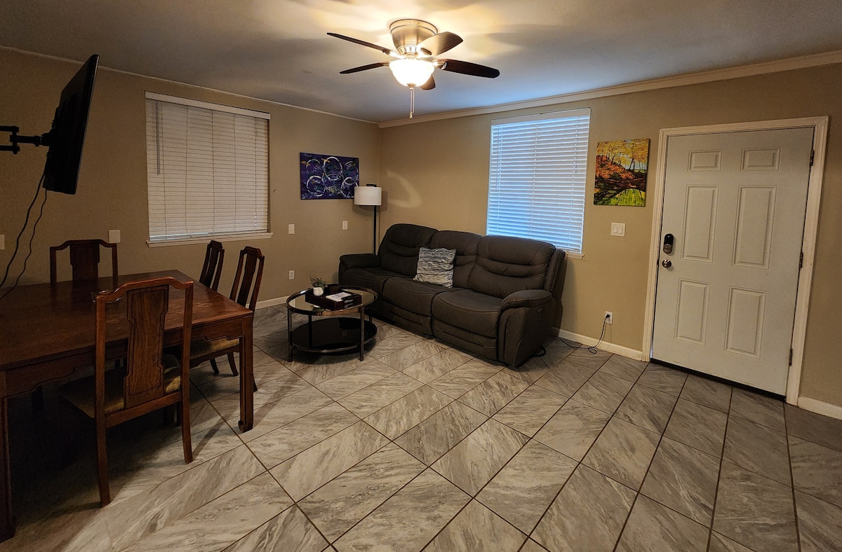 Forget your worries in this spacious and serene space. This home features two bedrooms, each furnished with a cozy queen-size bed and its own full bathroom. The spacious living room offers comfortable European velvet chairs, a convertible leather sofa bed, a water dispenser, and a Smart TV, among other amenities. You'll also have access to a washer and dryer for your convenience. Fresh sheets, linens, and duvets are provided for each bed, along with extra towels.