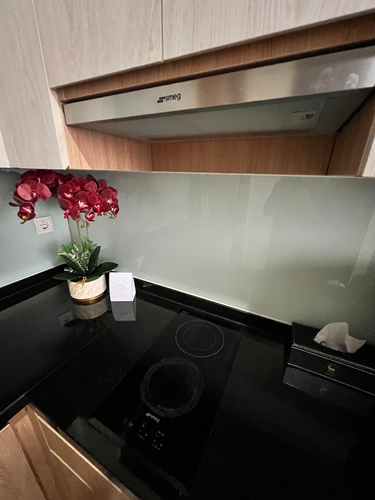 An elegant 24sqm studio in Jakarta's center, blending style and convenience. Includes kitchen, fast Wi-Fi, air-purification, 43" smart TV, sound system and Netflix. It is ideal for various stay types, with contactless access and amenities like pools, jacuzzi, gym, and basketball, Now features a Reverse Osmosis dispenser & food waste disposal, The picture shows a gas stove that has been replaced by an induction cooker (to follow the apartment guidelines for fire hazards)