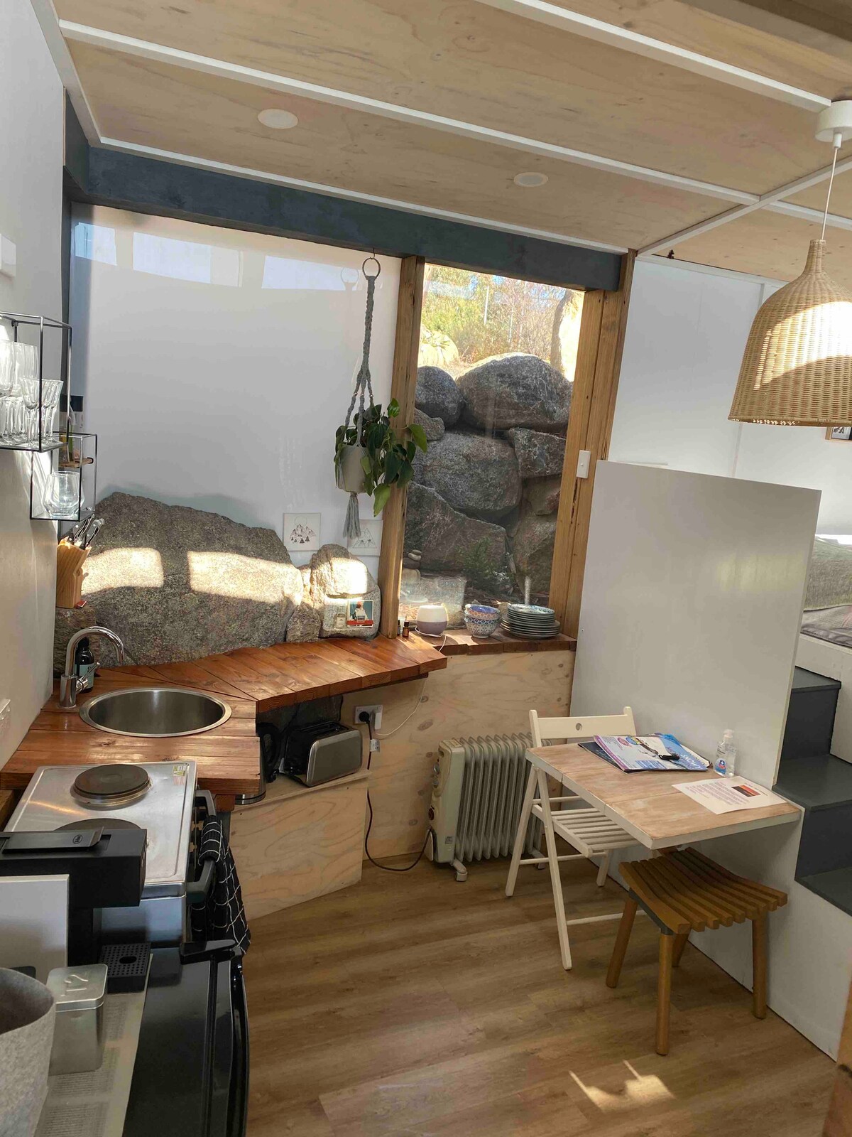 Čudovito oblikovan mini-hiška. Ta prostor je edinstven po svoji zasnovi in zavajajoč po svoji velikosti. Vgrajeno v domače skale in žvečilke, to mini-hiško zagotavlja občutek miru in spokojnosti. To mini-hiška si deli blokado z družinskim domom, vendar je popolnoma ločena in zasebna. Leseni ogenj in severni pogled nudita udoben prostor za sprostitev. Ta mini-hiška je zgrajena iz 70% recikliranih ali ponovno uporabljenih materialov.