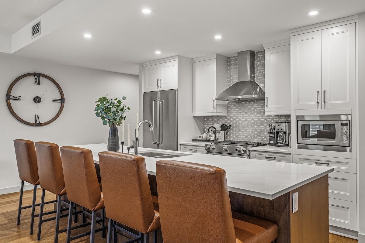 Dobrodošli v luksuznem oddihu v osrčju Canmora! Razkošna penthouse enota z osupljivim razgledom na gore! - To razkošno in posodobljeno večnadstropno podstrešno stanovanje je kotna enota, obrnjena proti jugu in ima spektakularen razgled na naravo. Vrhunsko in leseno pohištvo je ustvarilo sodobno počitniško hišo, ki ste jo obiskali. Fitnes center in romantična masažna kad na strehi na prostem s 360-stopinjskim razgledom na Bow Valley sta priročno oddaljena le nekaj korakov.