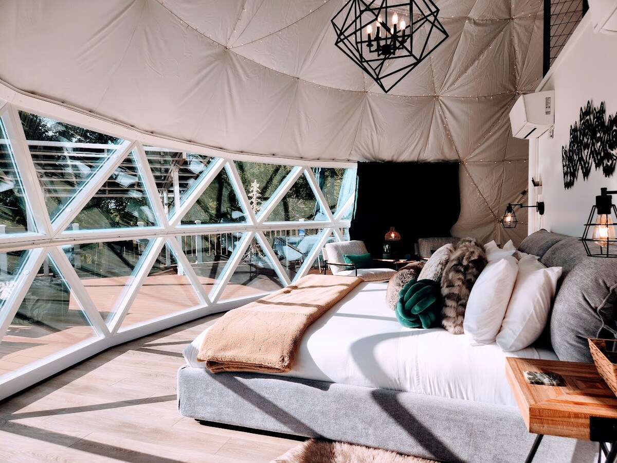 Winderdome Resort's Wolf Dome offers a King size bed on the main level and two Twin-XL beds in the loft. The Wolf Dome features a kitchenette, full bathroom, WIFI, BBQ, fire table and so much more. Come take in the sunset on your best vacation ever! We have a private outdoor pool, but note that pool access is not included with your Dome rental but can be rented separately. Rental is $110/hour, minimum 3hr rental. No pets and no children under 5 permitted.
