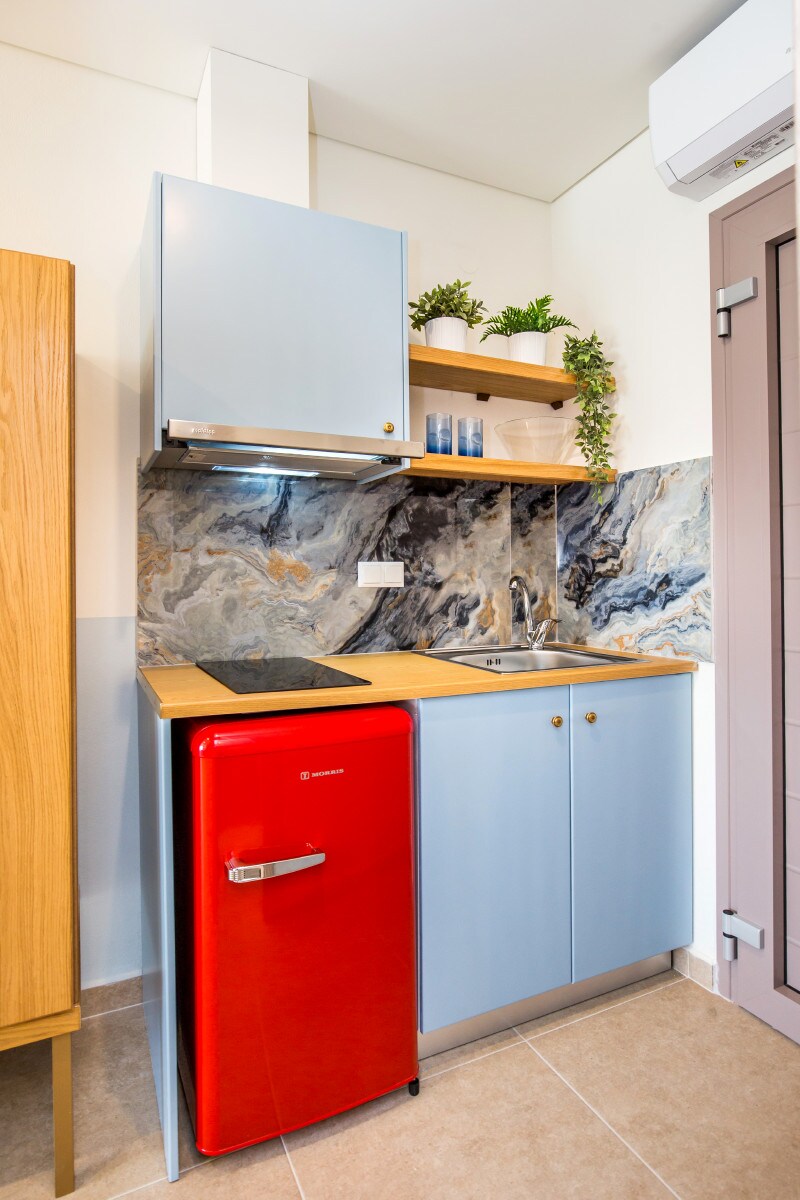 Zasebni studio z zakonsko posteljo, kopalnico, balkonom in opremo za pripravo zajtrka. Velik je 25 m2. Vključuje hladilnik, mikrovalovno pečico, aparat za kavo, opekač, pametno televizijo, klimatsko napravo, brezžični internet in toplo vodo 24 ur na dan. Balkon ima čudovit pogled na morje in se nahaja nasproti urejene plaže, restavracij, kavarn, barov in barov na plaži, pa tudi supermarketa, pekarne, lekarn, banke in različnih trgovin. Nahaja se v prvem nadstropju stavbe brez dvigala.