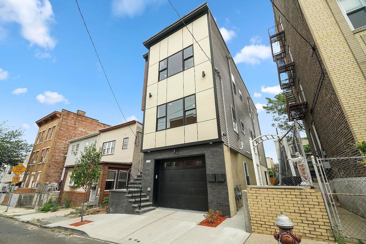 Odkrijte New York brez napora! Minute od letališč Newark (NWK) in JFK, naša lokacija ima postajo Light Rail čez cesto. Uživajte v prijetnem bivanju z zakonsko posteljo iz spominske pene, raztegljivim kavčem in prostorno garderobno omaro. Ostanite povezani s hitrim omrežjem Wi-Fi, namenskim delovnim prostorom in dvema pametnima televizorjema 4k UHD Roku. Kopalnica nudi brezplačne toaletne potrebščine, popolnoma opremljena kuhinja pa zagotavlja udobje. Izkoristite zasebno garažo, dostop do telovadnice in pralni/sušilni stroj v enoti za brezhibno doživetje.