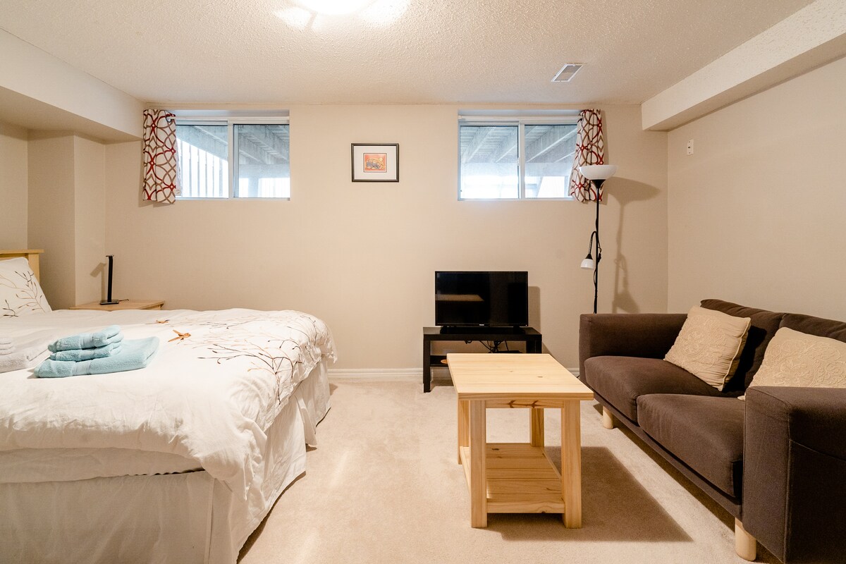 Čisto, pametno, samostojno kletno stanovanje z vhodom s kodo. Zakonska postelja (Queen), majhna delovna miza, kuhinja, kopalnica s kadjo. TV z vsemi običajnimi aplikacijami – Netflix, Crave. V bližini so kavarne, pubi, restavracije, tržnica, čista plaža za kopanje pa je le kratek sprehod stran. Tramvaj 501 Queen vozi do središča mesta in nazaj. Najbližje Airbnb prenočišče glasbenemu prizorišču HISTORY – prizorišče lahko vidite z vhodnih vrat! Brezplačno parkiranje na dovozu pred enoto. Polnjenje električnega vozila na 1. stopnji.