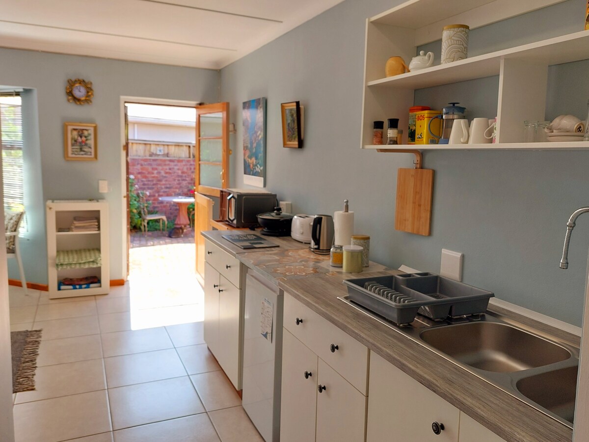 Ideal for short stays. Secure off-street parking. Convenient position - 5 mins from Airport, St George's Park, Grey schools. 7 mins to Beachfront. 35 mins to Addo Elephant Park. Located in the garden of a family home and the owner's art studio. Full en-suite bathroom the kitchenette has a kettle, microwave and fridge. Queen double bed, free Wifi, solar electricity and independent water supply. Cafés, shopping centre within 5 minutes walking distance.