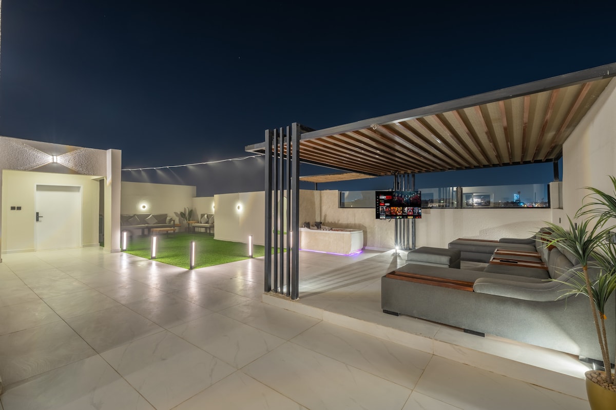 Luxury 2BR apartment with a private rooftop jacuzzi in Al Malqa, North Riyadh. Enjoy a stylish stay featuring a 75" QLED Smart TV with Netflix, Disney+, Shahid, and OSN. The rooftop offers a beautiful view, outdoor seating, and a cooling mist system for a refreshing atmosphere. High-speed fiber Wi-Fi, coffee machine, electric oven, and self-check-in. Perfect for couples and relaxing rooftop evenings.