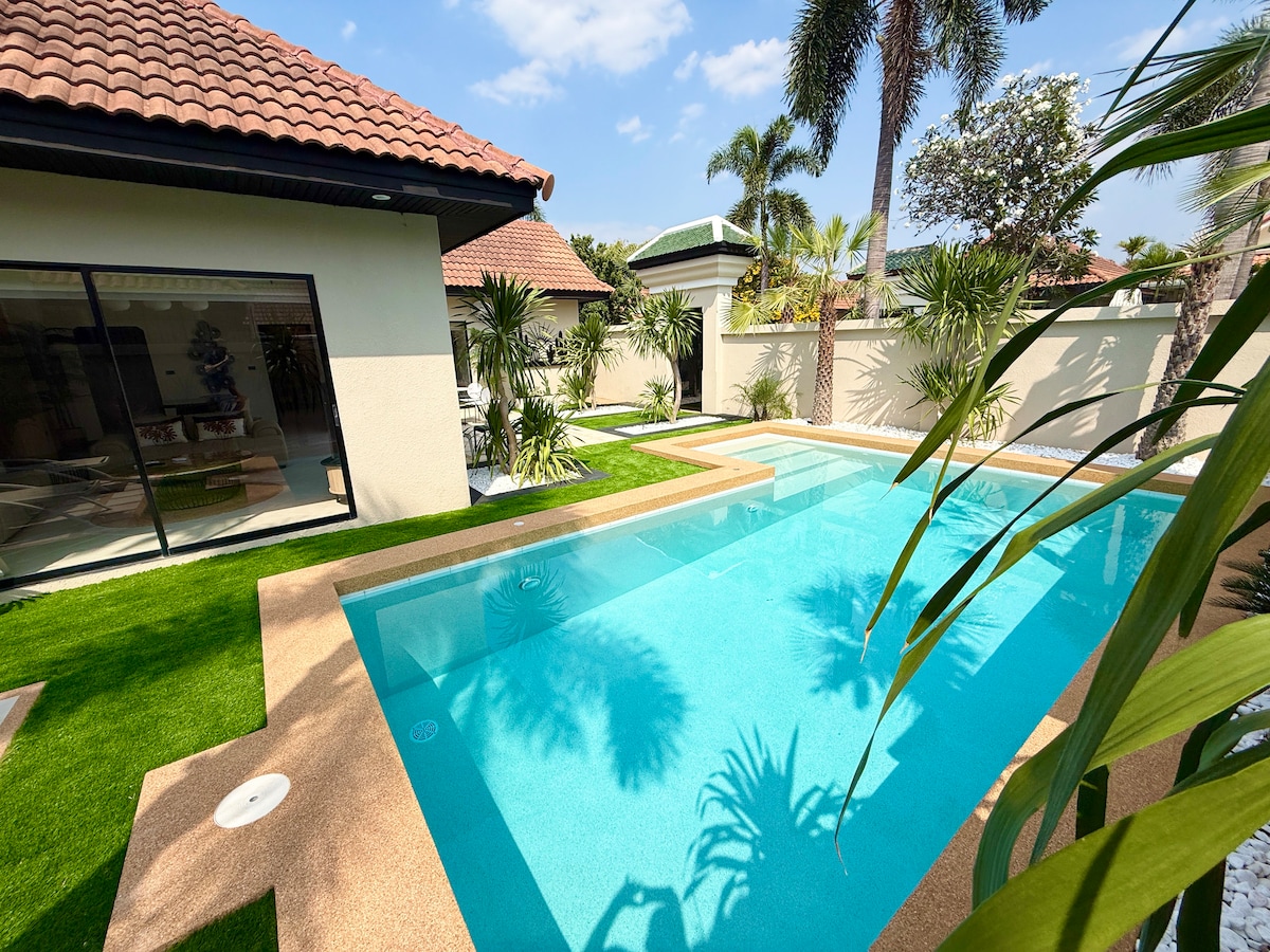 Brez stroškov storitve Airbnb. Vrhunska zasebna enosobna vila z bazenom na varnem posestvu z 24-urnim varovanjem. Popolnoma prenovljeno in profesionalno opremljeno prenočišče za sproščujoče bivanje. Idealno za pare ali majhne družine. Uživajte v zasebnem bazenu in dostopu do bistroja, bara, skupnega bazena in klubske hiše na posestvu. Vas Jomtien z enostavnim dostopom do vsega, le 800 m od plaže. Idealno za miren in zaseben oddih.