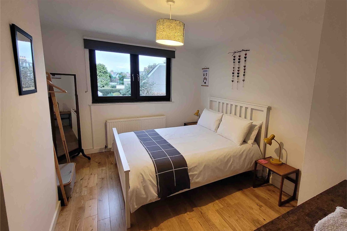 Uživajte v elegantnem doživetju v tem bivališču, ki se nahaja v središču mesta. Dve dvoposteljni spalnici z brezplačnim parkiriščem in tramvajsko postajo 5 minut hoje stran. Odlične avtobusne povezave po vsem mestu in tramvaj, ki vas v 20 minutah pripelje naravnost iz letališča Edinburgh do stanovanja. Gostitelj živi v stanovanju v nadstropju, zato bodo morebitne težave takoj odpravljene. To je mirno stanovanjsko območje, zato ne prirejajte zabav. Hvala.