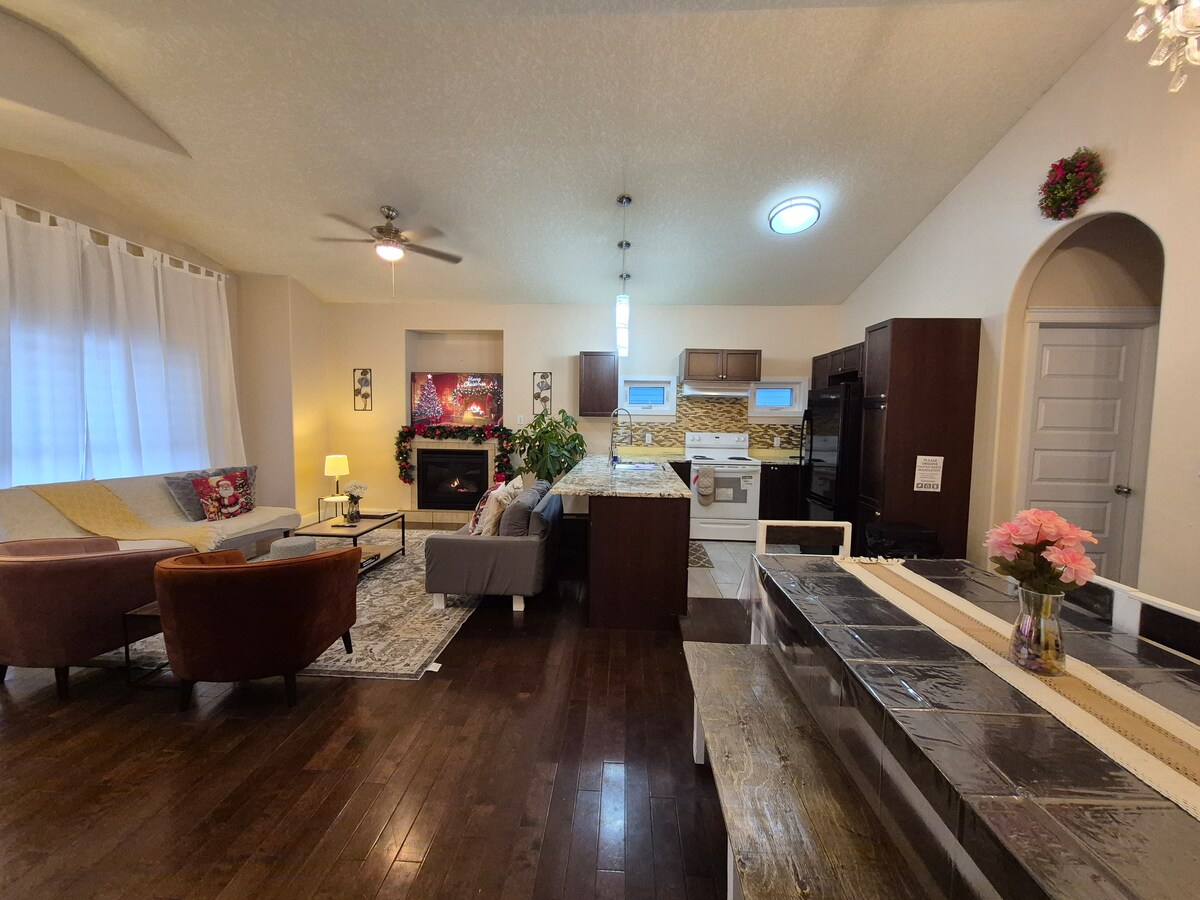 Predstavljajte si, da se sproščate v čudovitem prenočišču z zasebno zeleno površino. Nahaja se le nekaj minut od avtoceste Anthony Henday, zato, da lahko v nekaj minutah pridete kamorkoli v Edmontonu. ✔ 2300 kvadratnih čevljev z OGROMNIM dvoriščem in teraso! ✔ Klimatska naprava! ✔ 3 spalnice - odlično za družine! Prostor✔ , primeren za otroke! ✔ Igre in zabava! ✔ Parkiranje v garaži Zakonska postelja (✔King) s kopalnico v spalnici ✔ Hitri Wi-Fi in Roku televizorji ✔ Idealno za daljša bivanja! ✔ Popolnoma opremljena kuhinja, ✔ 15 min do mednarodnega letališča YEG! Rezervirajte bivanje še danes!