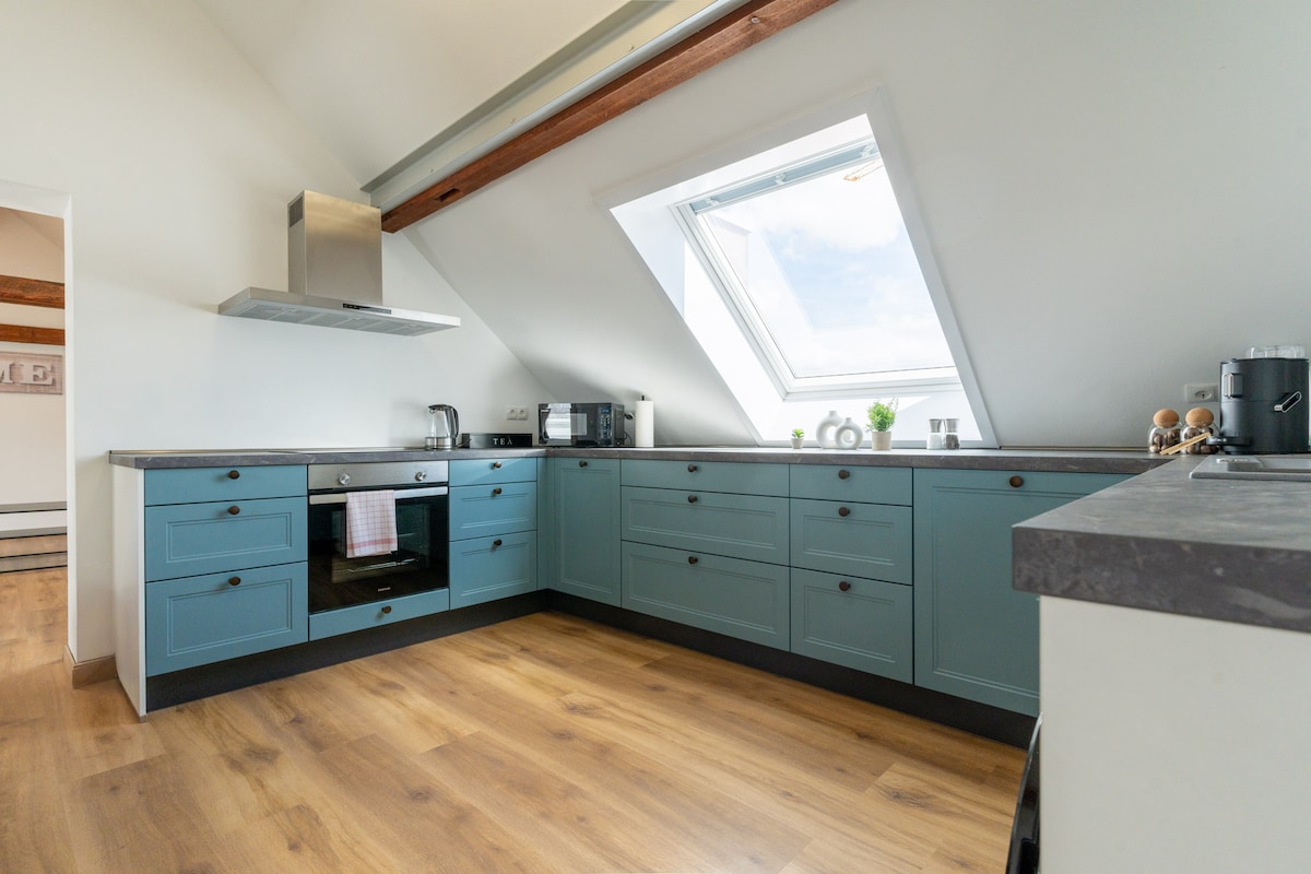 Karibu Nyumbani! Wir begrüßen dich ganz herzlich in unserer wunderschönen Maisonette-Wohnung in bester Lage, die dir für deinen Aufenthalt alle Annehmlichkeiten bietet. Die offene Gestaltung mit den sichtbaren Tragbalken versprüht einen supergemütlichen Charme, die stilvolle Einrichtung lädt zum Wohlfühlen ein. Neben der voll ausgestatteten Küche inkl. Geschirrspüler gibt es einen Arbeitsplatz, Smart-TV, WaMa, eine freistehende Badewanne sowie einen überdachten Balkon.