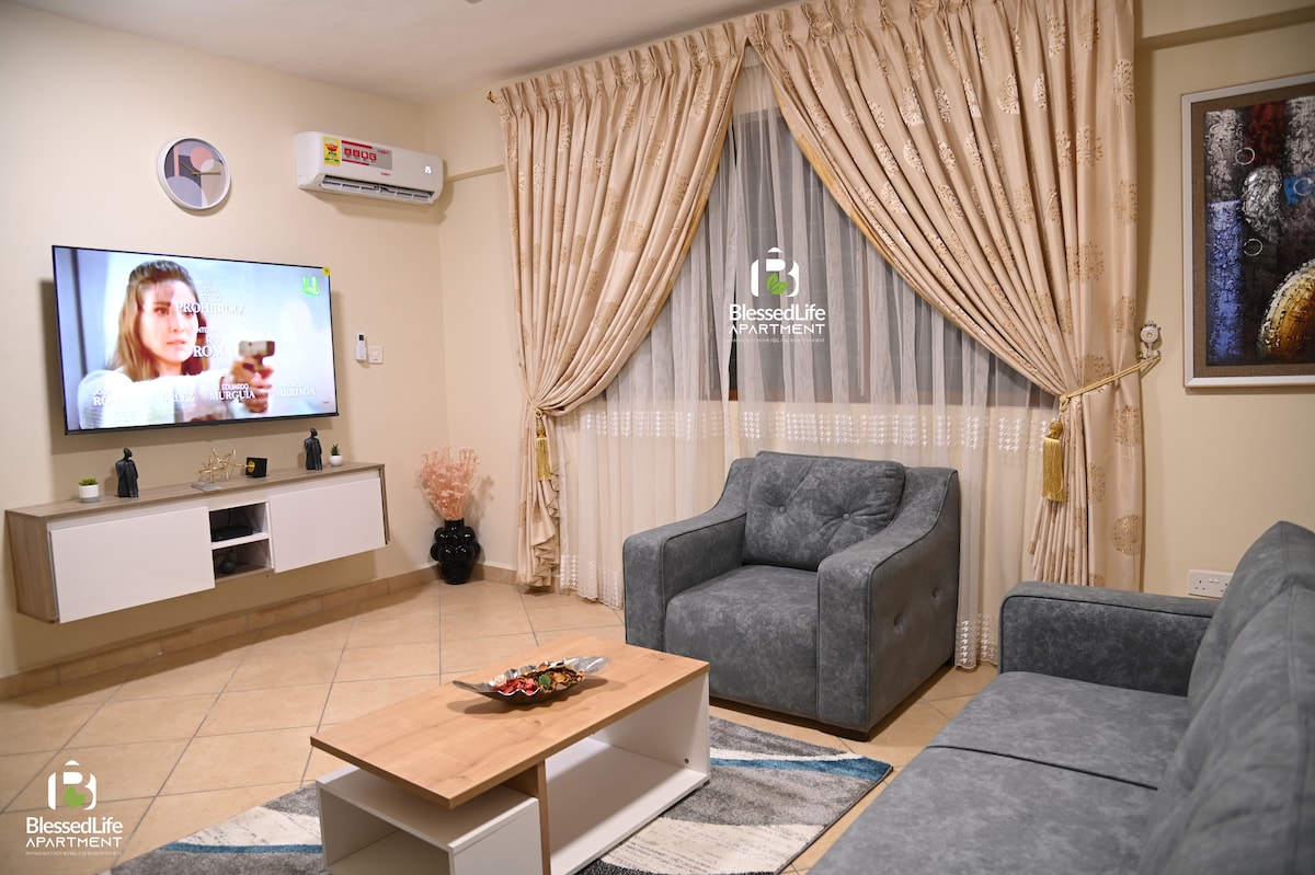 Spacious luxury 1-bedroom with modern kitchen, DSTV, Netflix, WiFi, secure parking, and standby power.