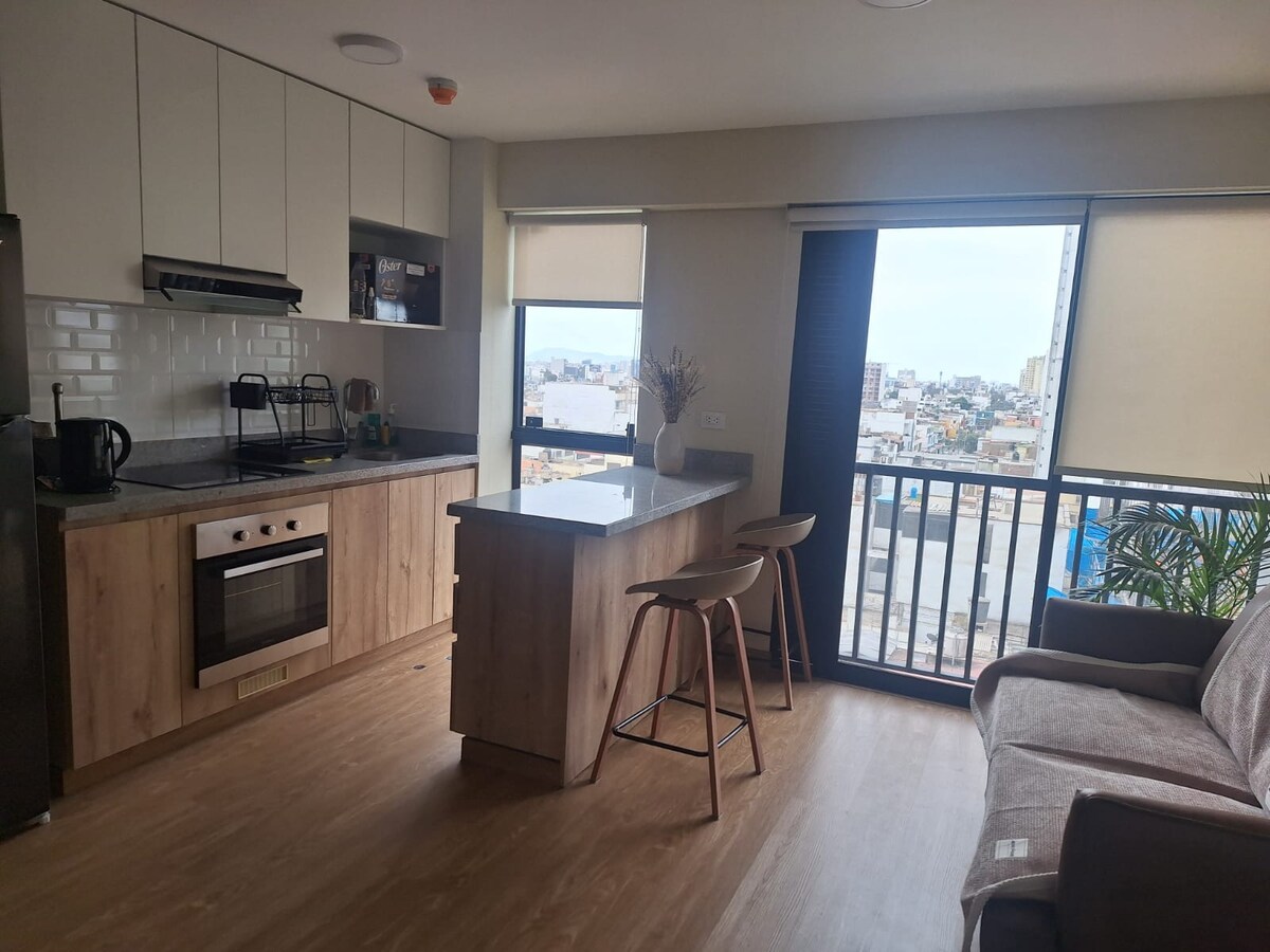 Bienvenido a Refugio 16🌿Apartamento de estreno con vista Panorámica en un edificio moderno con Vigilancia 24 h, diseñado para ofrecer descanso, tranquilidad y confort. Ideal para recorrer Lima en pareja, familia ó estadías corporativas. Perfect ubicado: En una zona céntrica, tranquila y tradicional de Lima, cerca de museos y restaurantes emblemáticos como el Bolivariano, Museo Larco, Taberna Queirolo. A minutos del Aeropuerto,Plaza San Miguel y zona financiera. ¡Será un placer recibirte! 💚