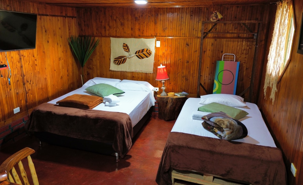 Uživajte v toplini te namestitve v najboljšem toplem vremenu Quindío, kjer boste lahko uživali v neverjetnem počitku. S čudovitim razgledom na Guadual lahko uživate v sončnih vzhodih, polnih zvokov edinstvenih ptic na tem območju. Vreme je idealno za počitek in prijetno bivanje. Obkroženi boste z naravo in občutkom umika na drugem mestu.