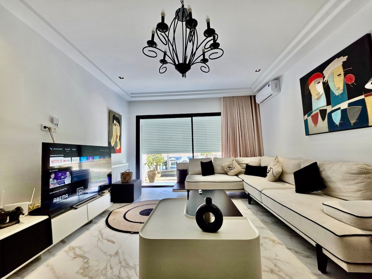 To edinstveno stanovanje, ki se nahaja v novi soseski, blizu vse opreme, je pravi poklon znanju lokalnih obrtnikov, ki so vsi prispevali k izboljšanju tega prostora. V toplem in gostoljubnem vzdušju boste imeli priložnost, da v celoti izkusite pristnost in bogastvo tunizijske umetniške kulture, ki je neprimerljiva v tej vrsti. Vsaka podrobnost je bila skrbno premišljena, da bi zagotovili nepozabno bivanje.