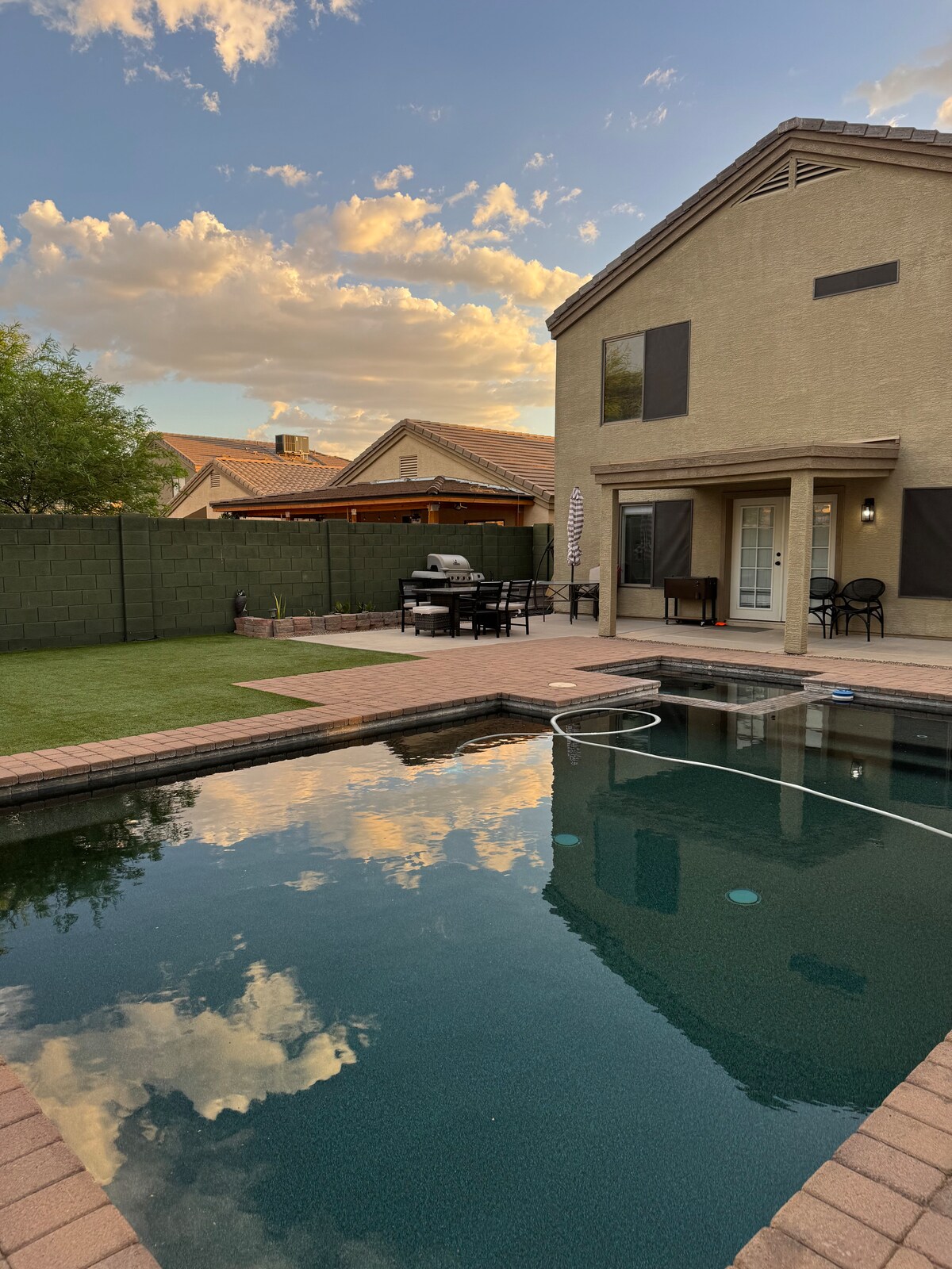 Spacious 4 Bedroom retreat on Desert Lane—perfect for families, golf getaways, relaxing escapes, or travel work! Enjoy a foosball table, board games, a grill, and garage parking. Access the community pool just steps away. Located in a quiet neighborhood just 15 mins from State Farm Stadium, minutes from great golf courses, Spring Training facilities, shopping, dining, entertainment, and 35 mins from PHX Airport. Whether you’re grilling, or catching a game, this desert stay has you covered!